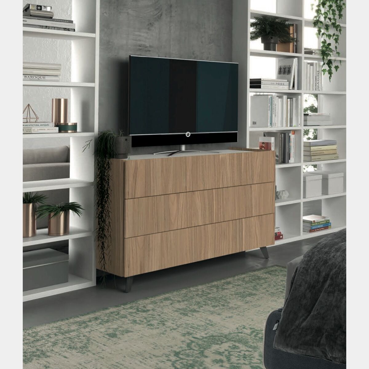 I 3 capienti cassetti sono dotati di meccanismo a chiusura rallentata, la loro altezza di 24 cm assicura un'ampia capienza al comò per garantire una totale funzionalità.