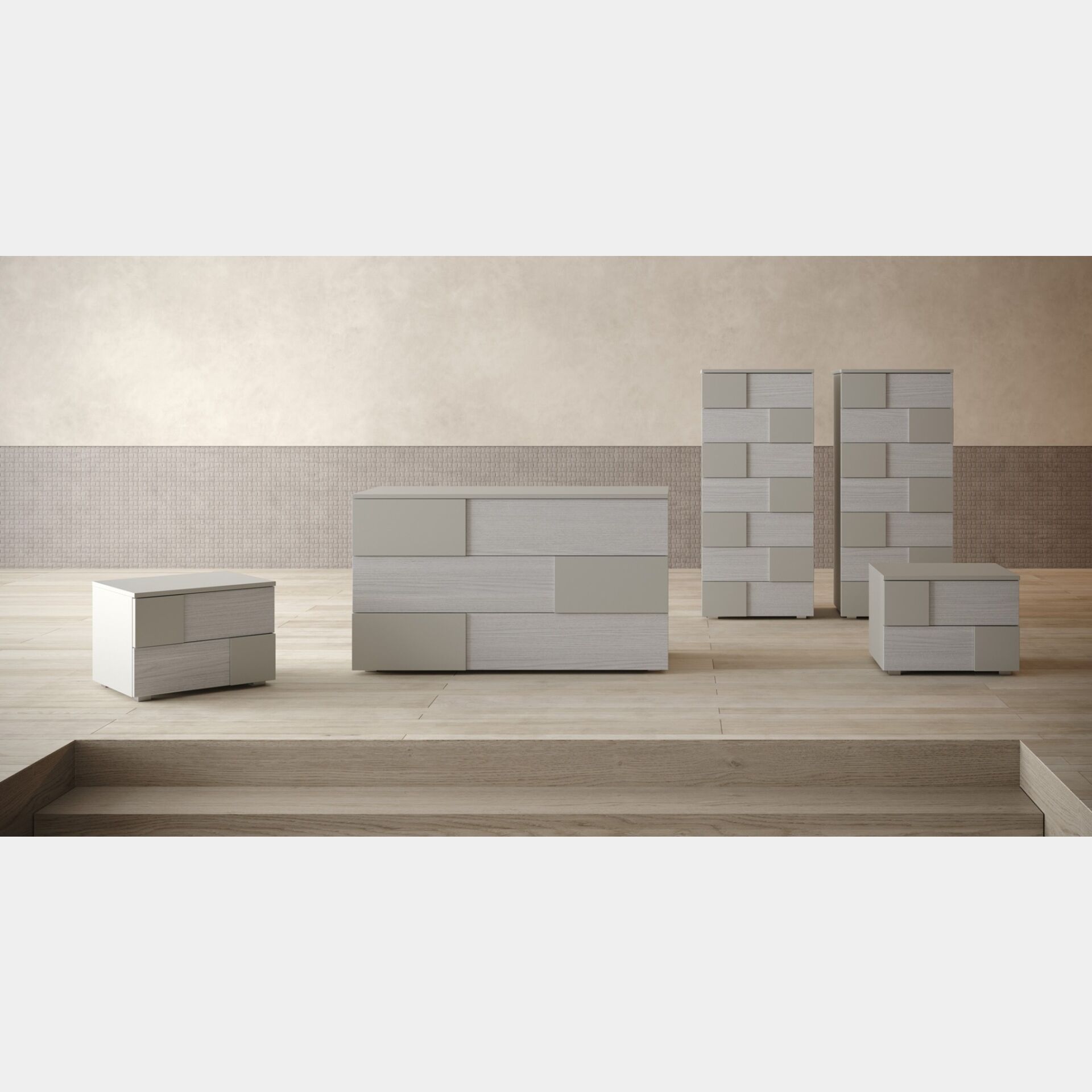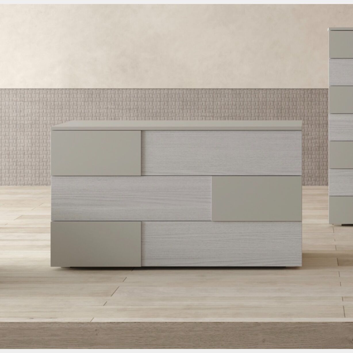 Complemento d'arredo dalle linee moderne e pulite bicolore. La linea Orizzonte è pratica e funzionale, realizzata in una finitura Nuvola frassinato e Laccato opaco Tele, composta da 3 spaziosi cassetti.