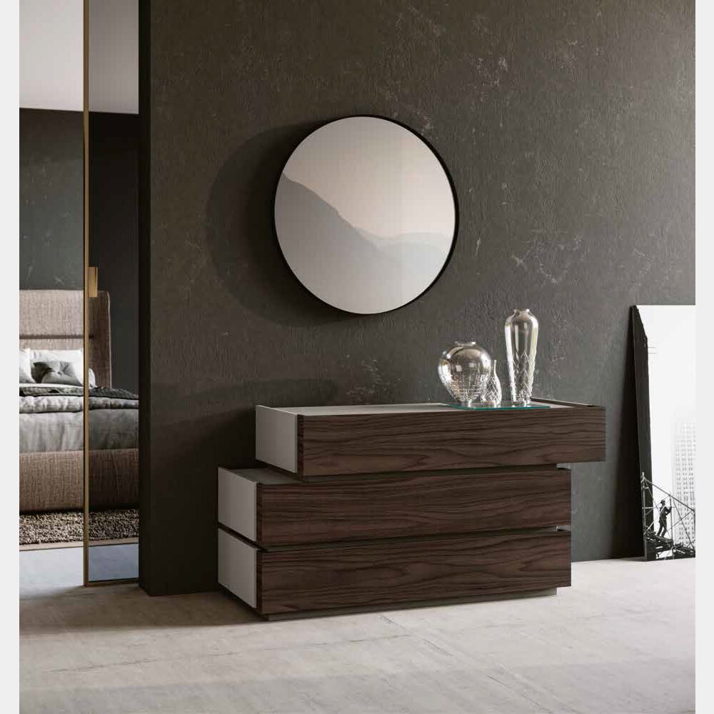 Grazie alla sua estetica il comò si adatta a tutti gli ambienti più moderni arredando con eleganza e stile la zona notte. In foto le finiture sono in Noce moro per i frontali mentre la struttura è in Grigio cenere. Questo accostamento dona carattere alla zona notte, offrendo un tocco elegante e personale.