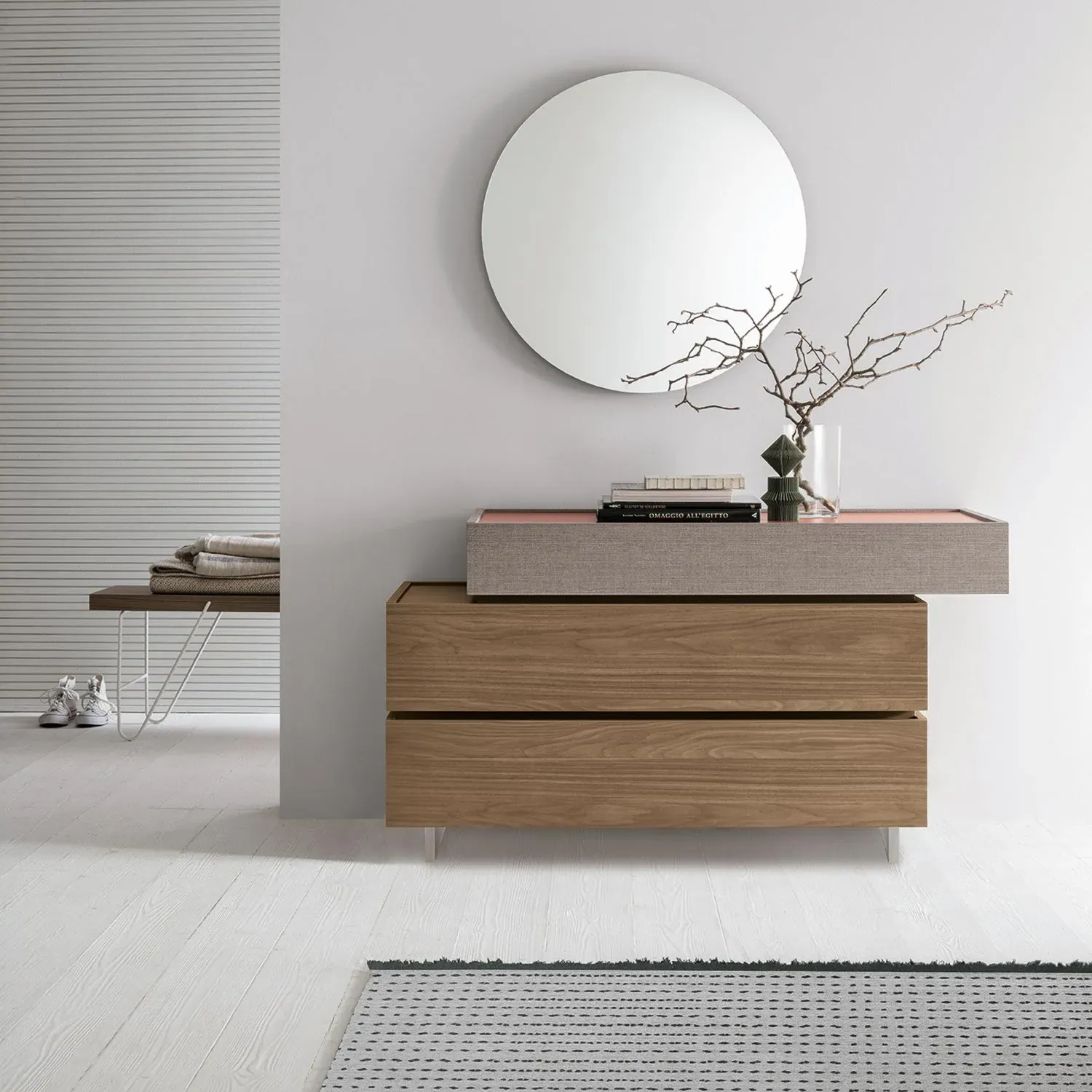Il comò Replay presenta tre capienti cassetti, l'apertura avviene a presa superiore o inferiore. I cassetti inferiori sono proposti in Noce ambra mentre il superiore in Alpaca, con vetro satinato Tabasco.