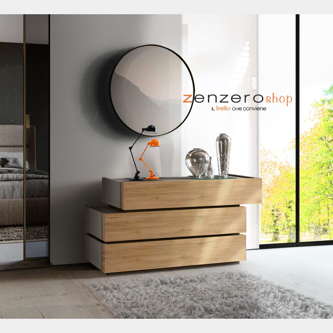 Il comò moderno presenta 3 ampi cassetti con maniglie a presa laterale,la trafiletta è in Grigio cenere così come lo zoccolo.