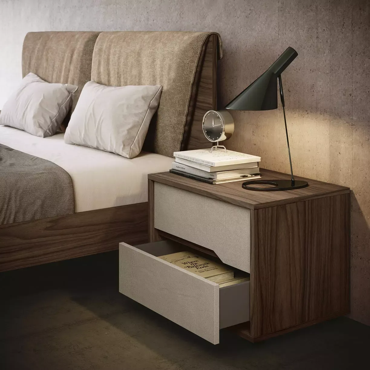 I comodini presentano due gole nei frontali in finitura Noce moro, che riprende la struttura, mentre i frontali sono in Argilla. La coppia di comodini a due cassetti può essere personalizzata nelle finture, è possibile sostituire la tinta sia di struttura che frontali per creare una combinazione adatta ai propri gusti.