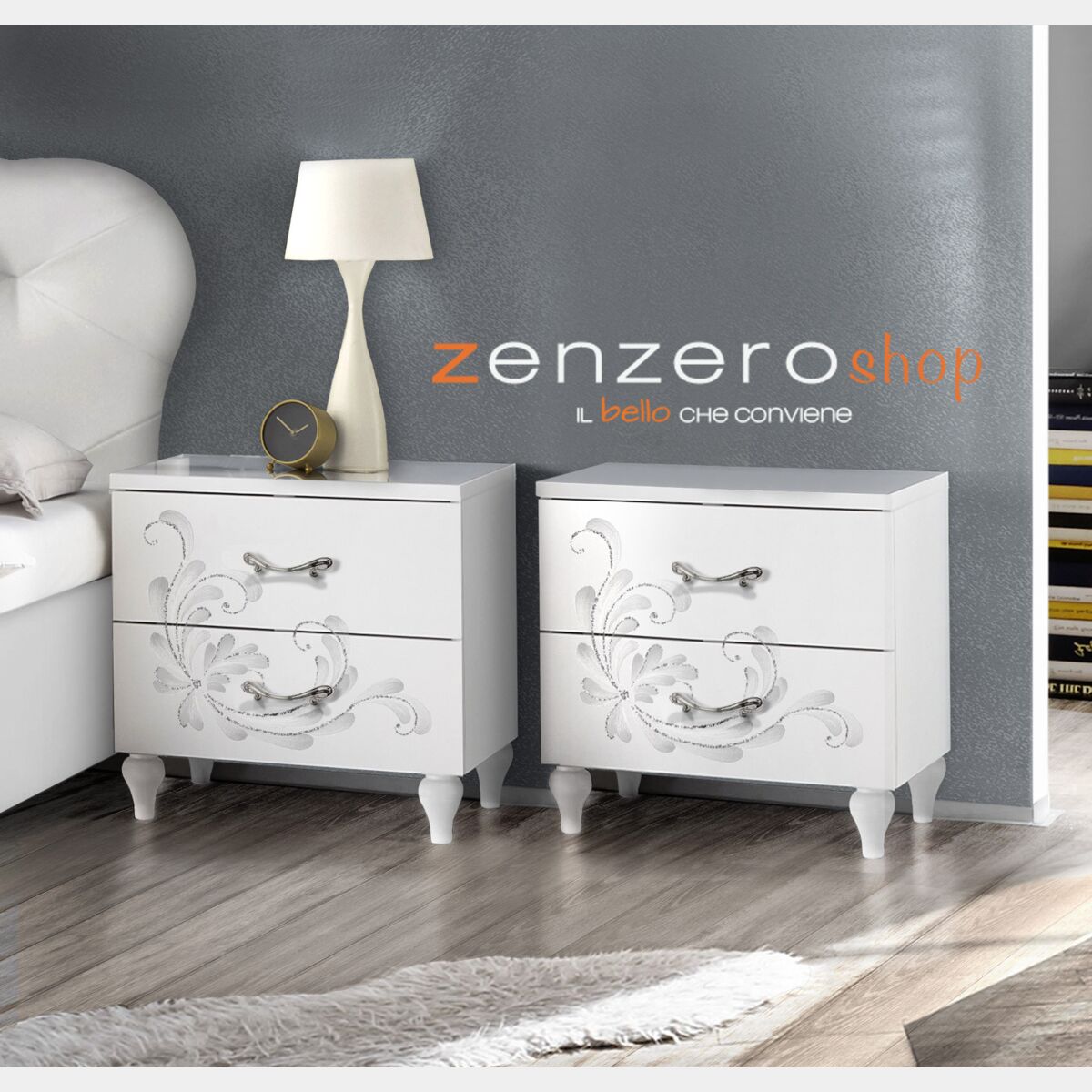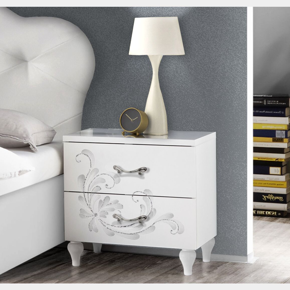I comodini presentano uno stil econtemporaneo, la serigrafia florale abbellita da brillanti e i particolari piedini rendono la coppia di comodini elegante, perfettamente adattabile ad una camera da letto moderna, ma anche tradizionale. Le particolari maniglie non passano inosservate: il loro design arrotondato assicura un arredamento unico e ricercato.