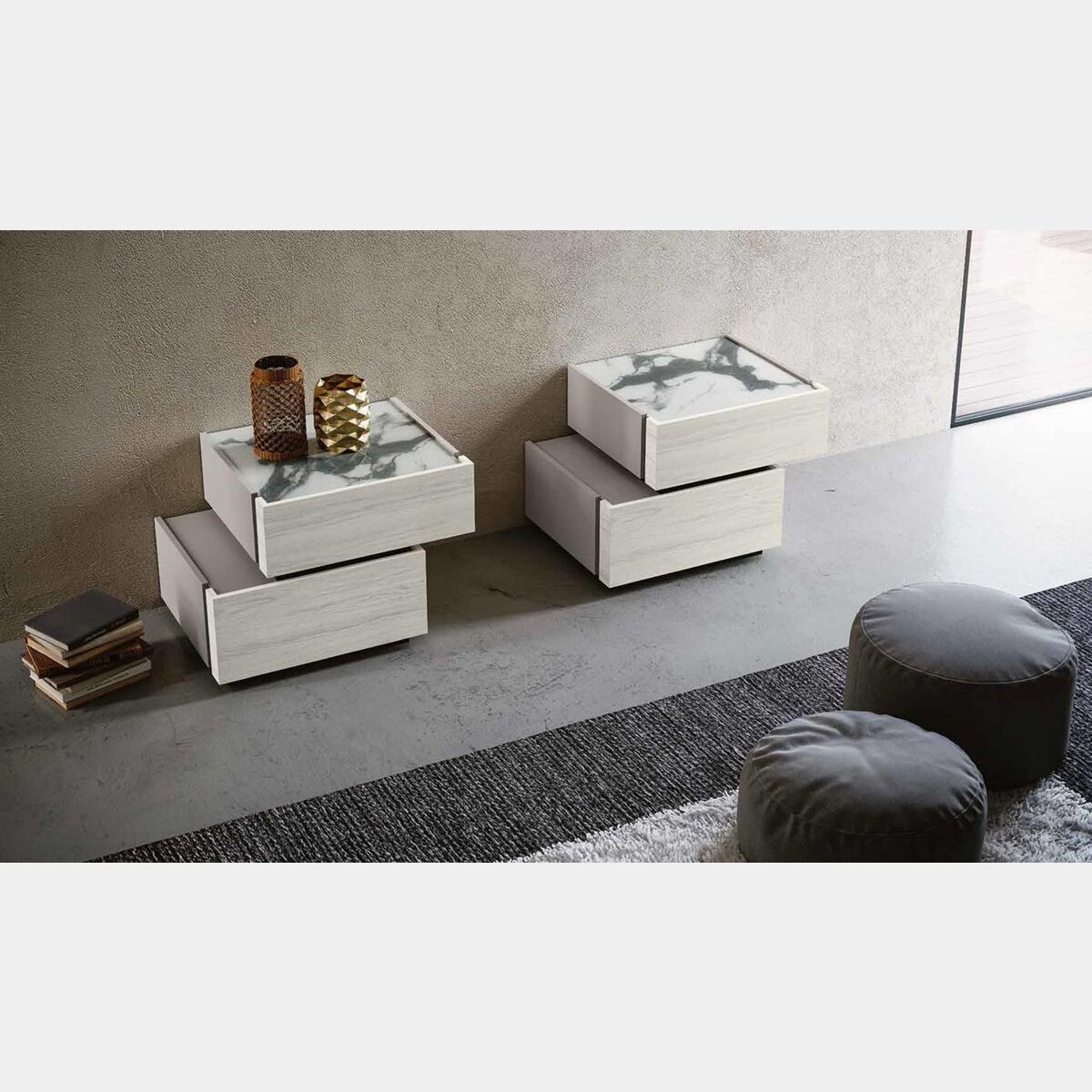 Comodini Palawan sfalsati, finitura Bianco altea e Grigio seta, top vetro