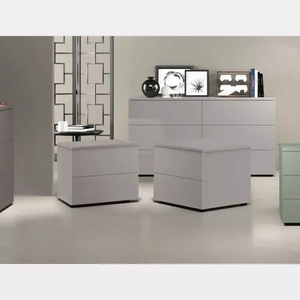 I comodini in finitura Grigio seta sono composti da 2 cassetti con apertura a presa laterale. I comodini poggiano su dei piedini registrabili anti ribaltamento.