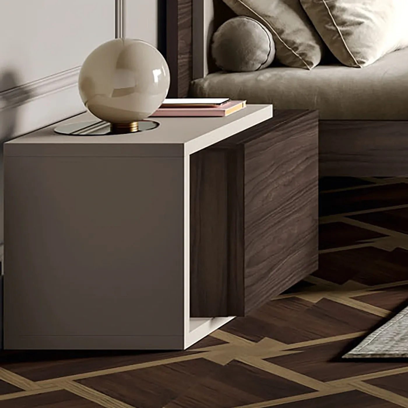 In secondo luogo, forma con il comodino un piccolo vano a giorno dove poter riporre libri o soprammobili da esposizione. Lo stesso è possibile fare anche sul top del mobile, al quale si sovrappone, con anche la possibilità di posizionarvi una lampada per le vostre letture notturne.