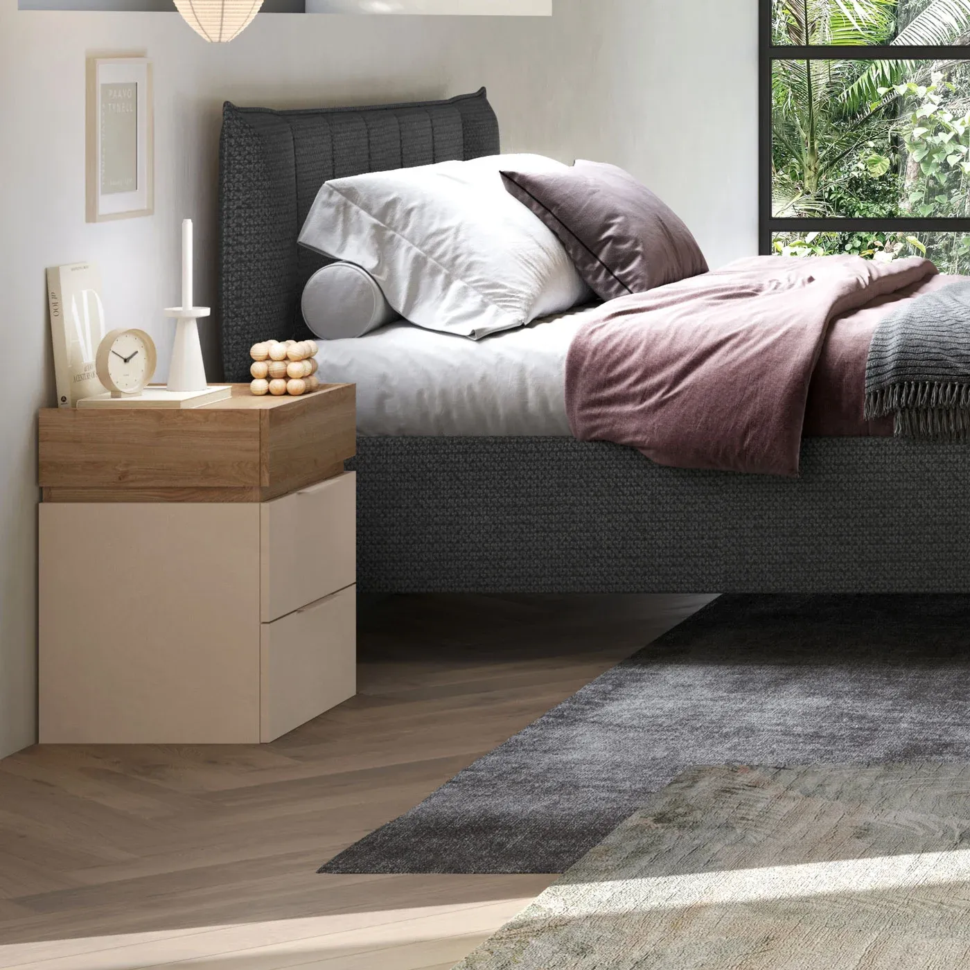 Comodino 3 cassetti moderno, finitura Cashmere e Cadiz. E' disponibile anche in versione Cashmere/Antracite e Cashmere/Mercure.