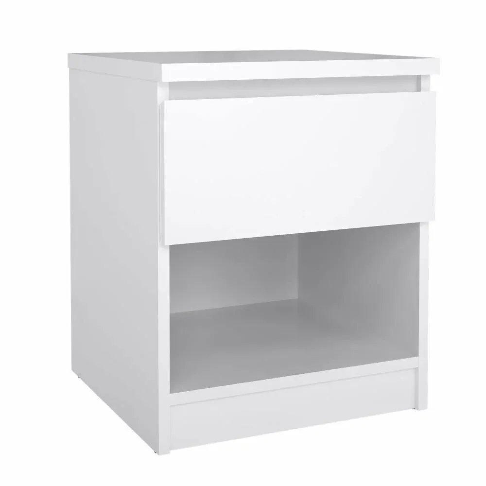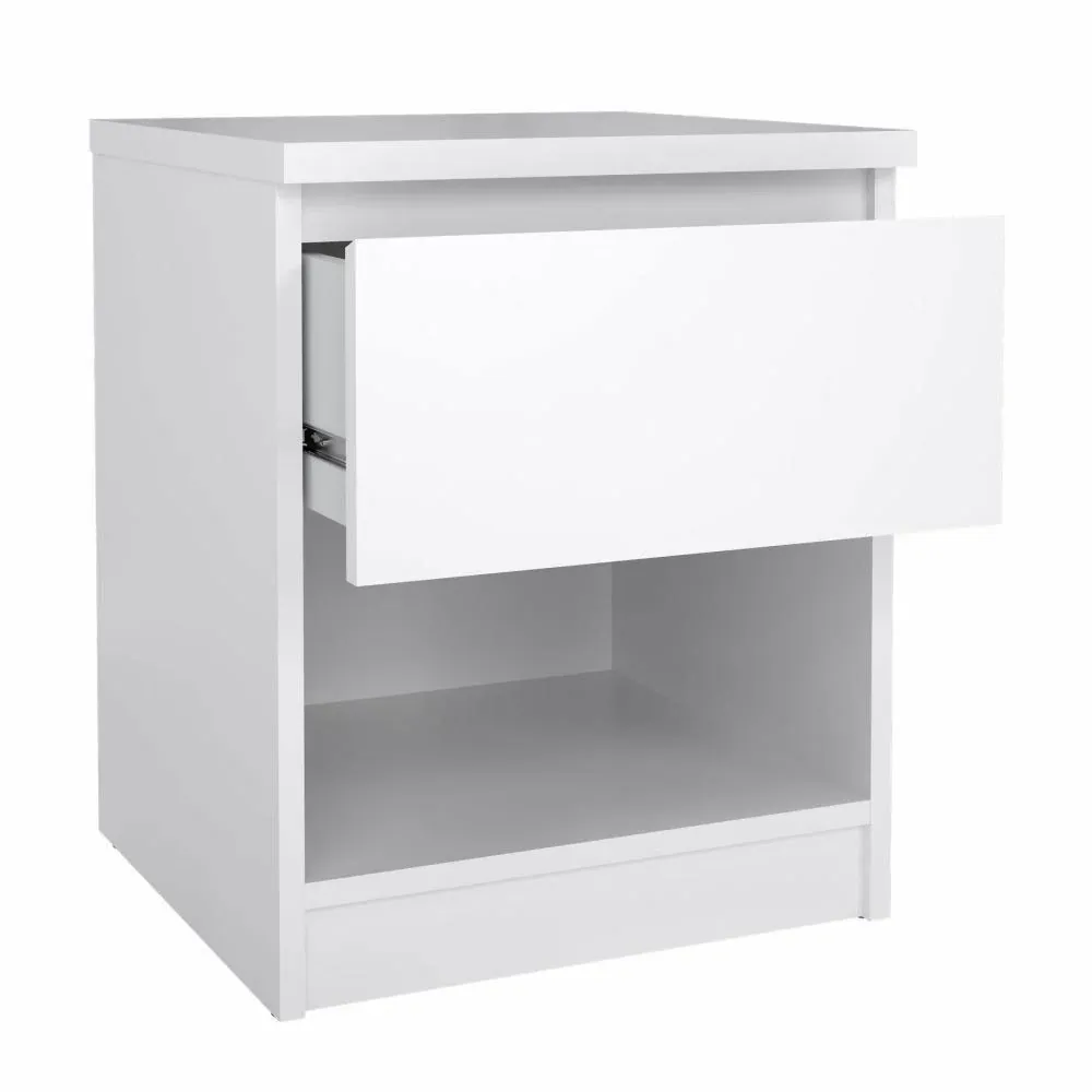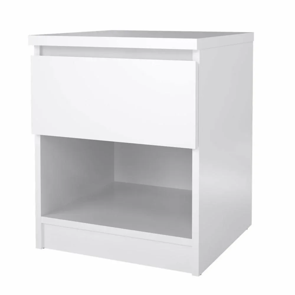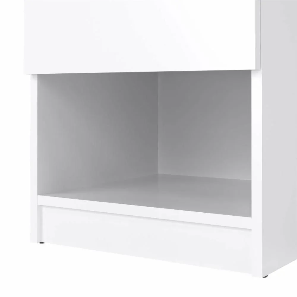 Comodino con un cassetto colore Bianco lucido. E' disponibile anche nei colori Calcestruzzo e bianco lucido, Rovere,Bianco lucido.