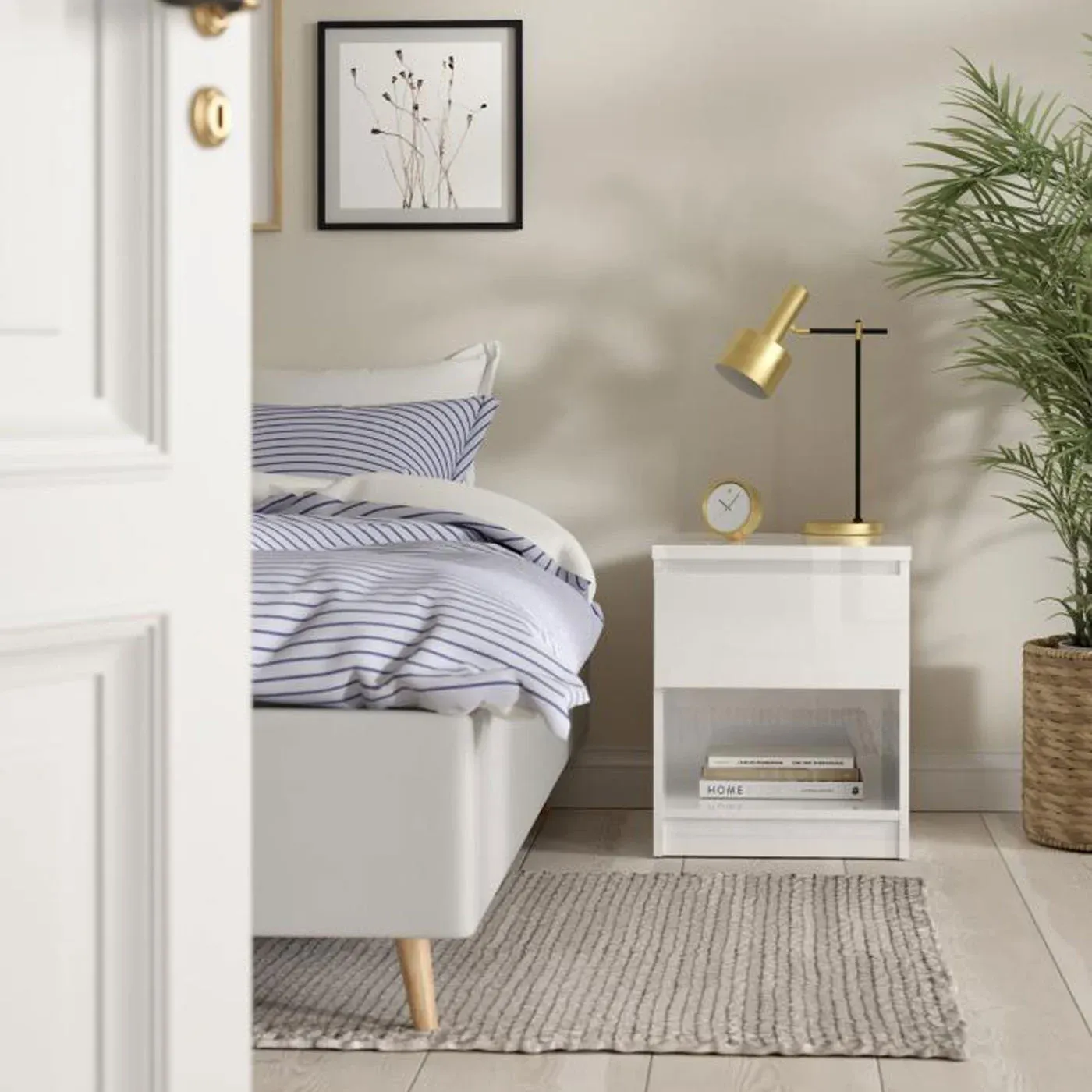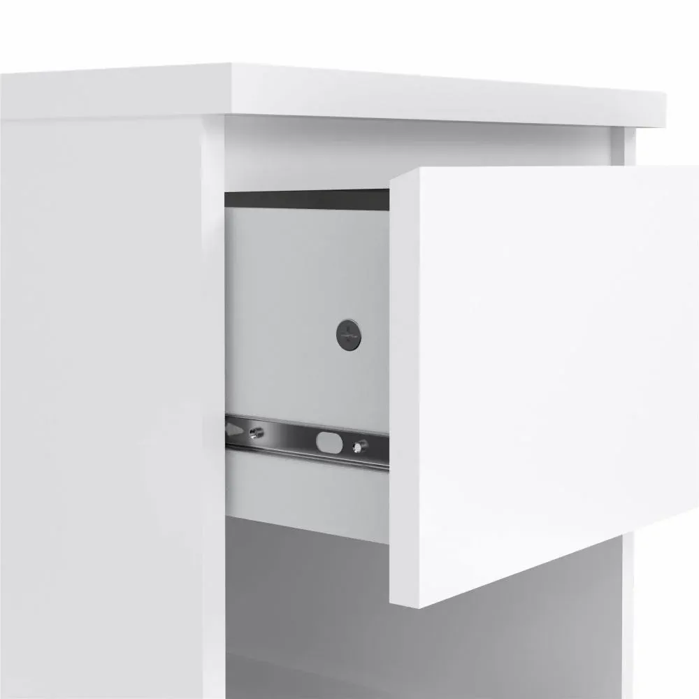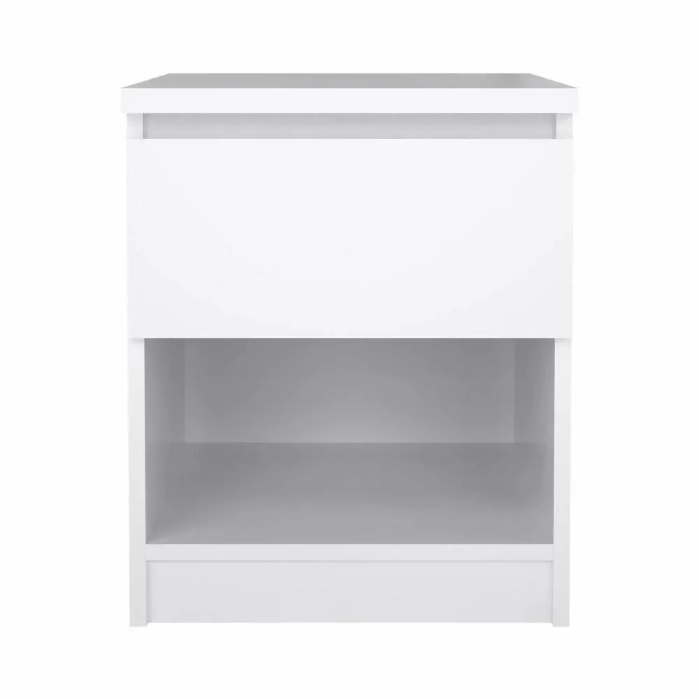 Comodino con un cassetto colore Bianco lucido. E' disponibile anche nei colori Calcestruzzo e bianco lucido, Rovere,Bianco lucido.