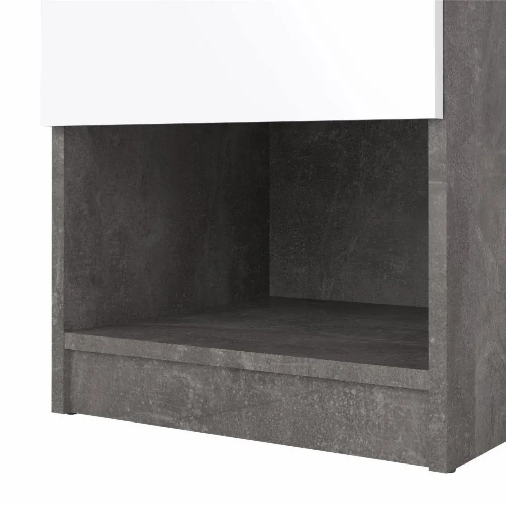 Elegante comodino Calcestruzzo e Bianco lucido. E' disponibile anche in versione Nero opaco, Rovere, Bianco lucido
