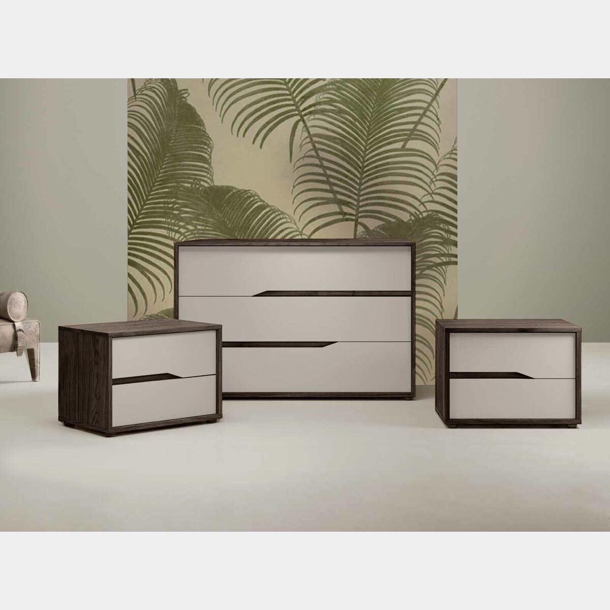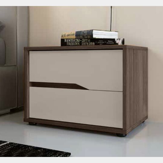 Il comodino presenta due gole nei frontali in finitura Noce moro, che riprende la struttura, mentre i frontali sono in una tenue tonalità di Grigio, il seta. Il comodino a due cassetti può essere personalizzato nelle finture, è possibile sostituire la tinta sia di struttura che frontali, creare la giusta combinazione significa adattare perfettamente il comò alla propria zona notte, facendo emergere la propria personalità.