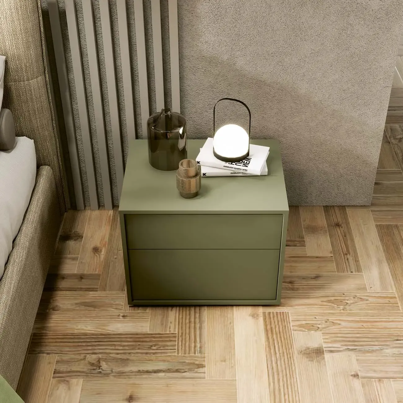 Comodino laccato Muschio a due cassetti, design moderno