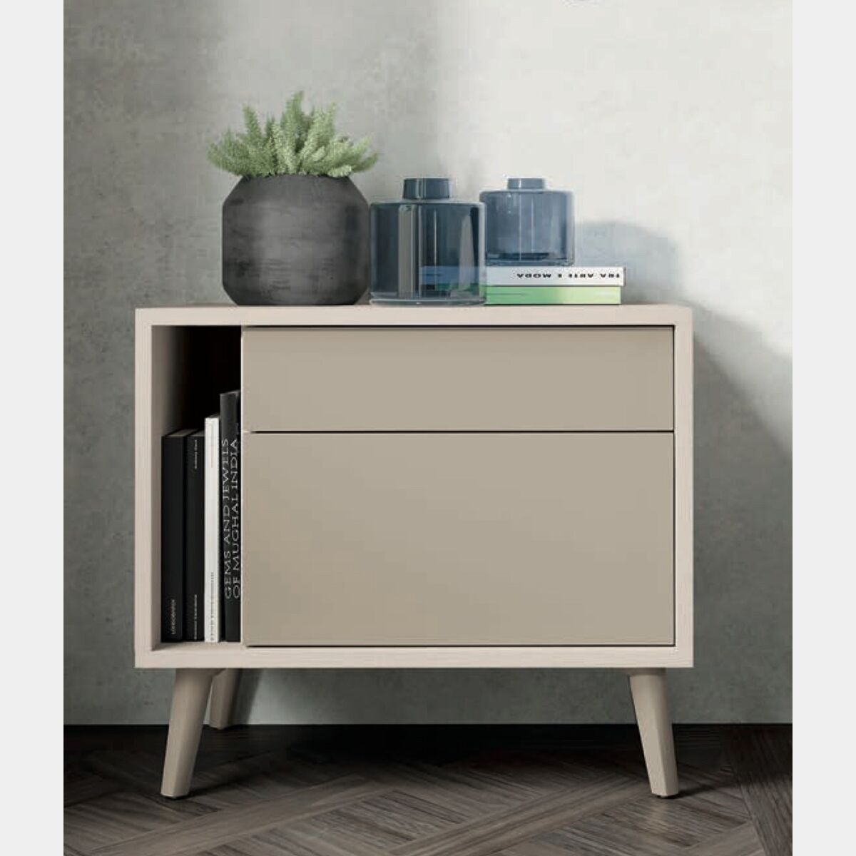 La finitura proposta per il comodino è Ciliegio bianco per la struttura, piedini e frontali sono Canapa. Grazie ad un'ampia gamma di colori è possibile personalizzare il comodino moderno per adattarlo al meglio al proprio stile ed alla propria camera da letto.