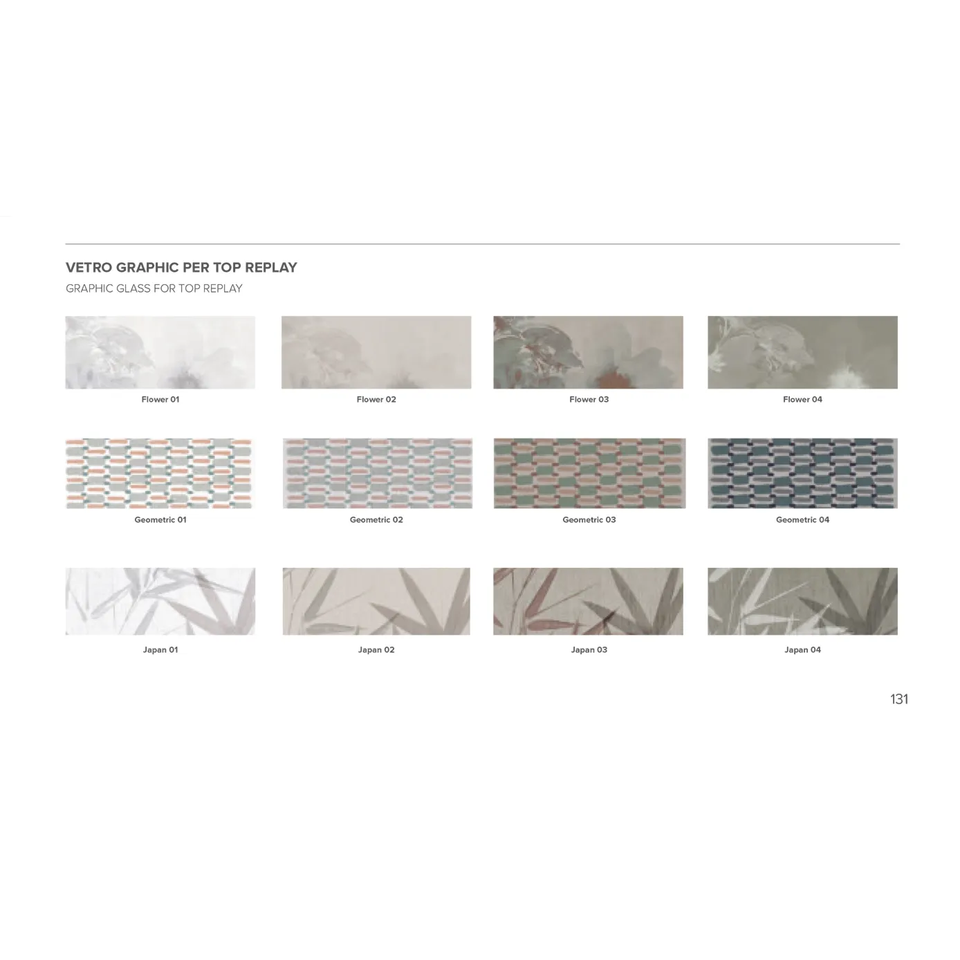 Replay aggiunge un tocco decorativo: il top in vetro è infatti impreziosito da una disegno grafico che conferisce originalità all’arredo in sé e all’ambiente nel suo insieme.