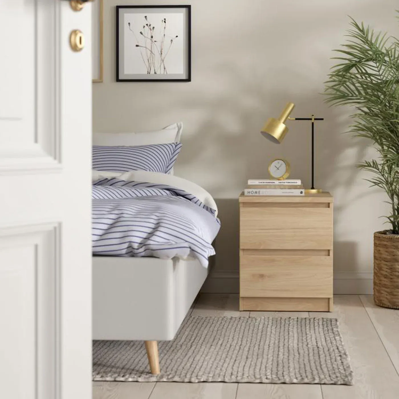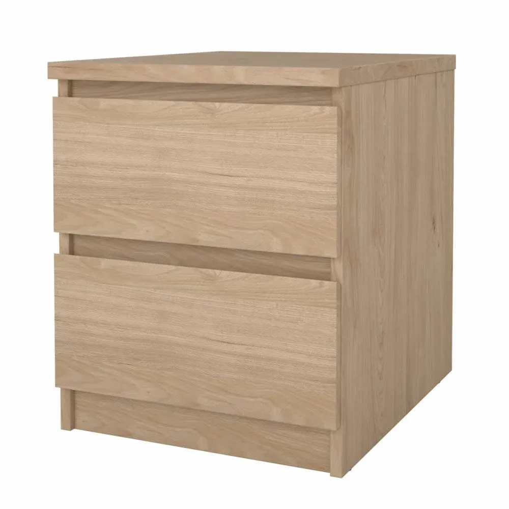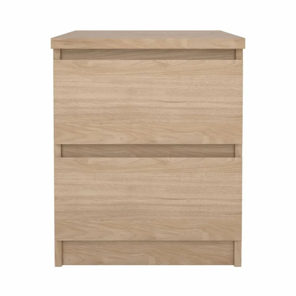 Comodino colore Rovere con due cassetti. E' disponibile anche in versione Nero frassinato, Nero opaco, Calcestruzzo e bianco lucido,Bianco lucido