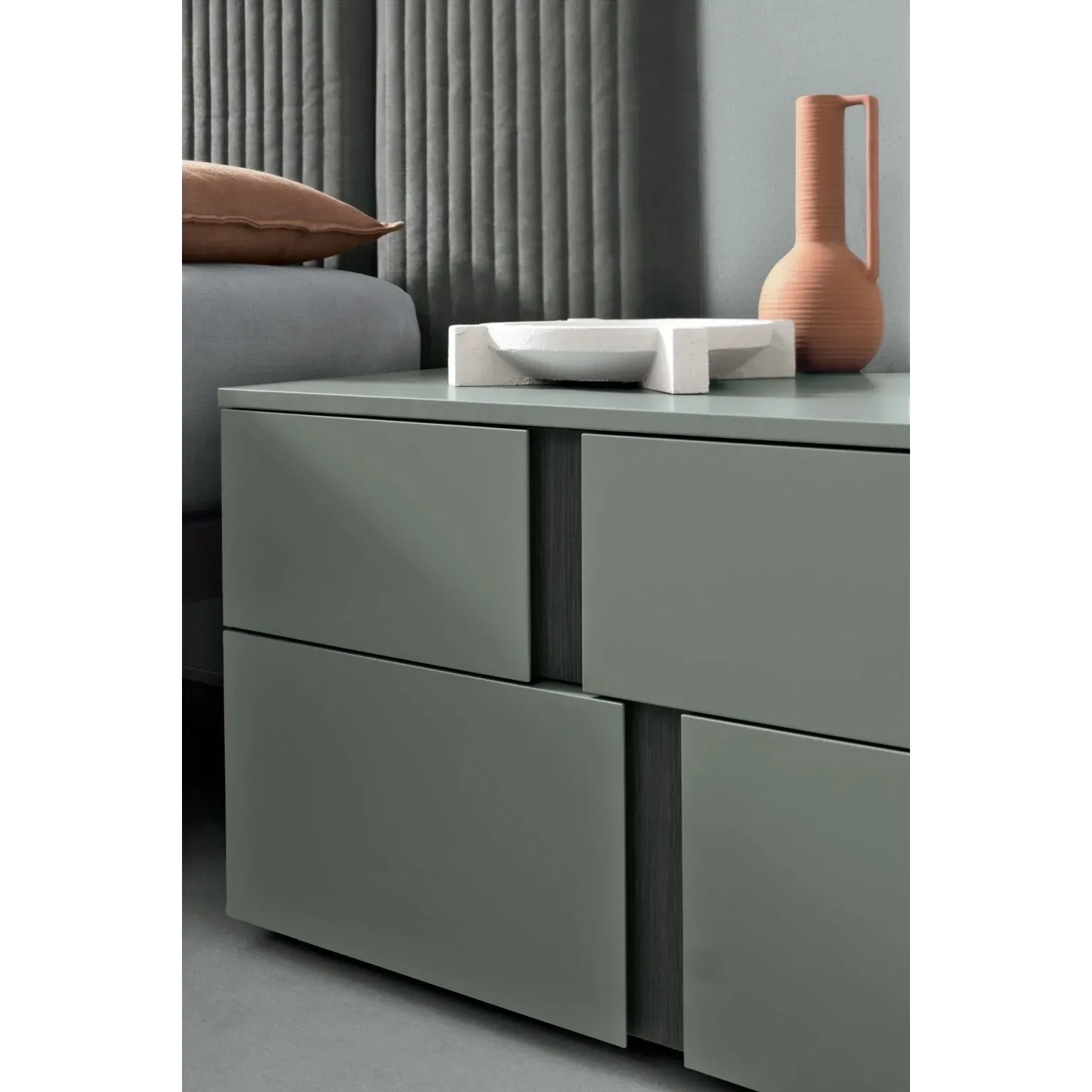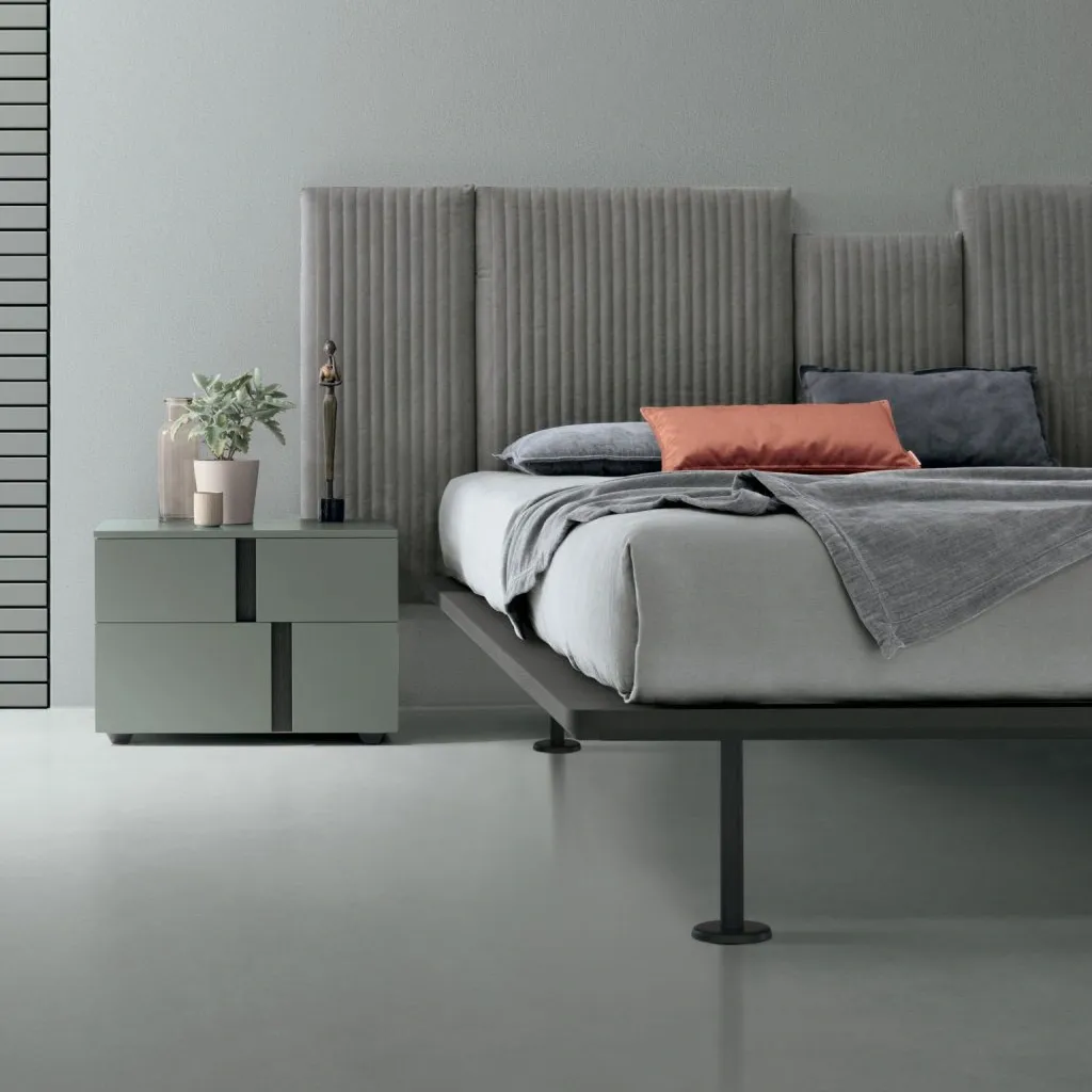 L’inserto maniglia in materico Rovere carbone dà dinamismo cromatico e geometrico al comodino in laccato opaco Basalto 177 e, allo stesso tempo,assicura uno stile di grande tendenza ad ogni zona notte.