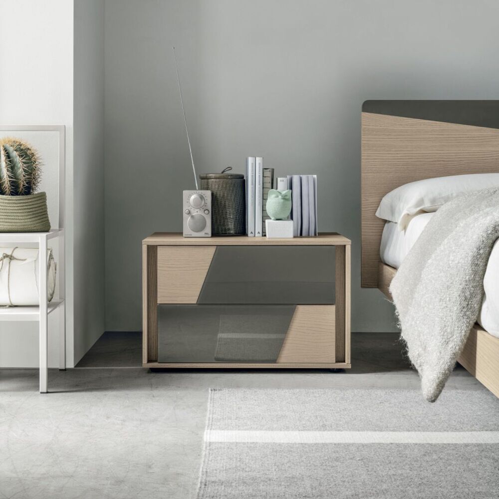 Sui frontali del comodino Kross, il materico Rovere sabbia è accostato al vetro lucido Smoke 328 per creare un effetto ricercato. Gli abbinamenti dettano lo stile e valorizzano la notte.