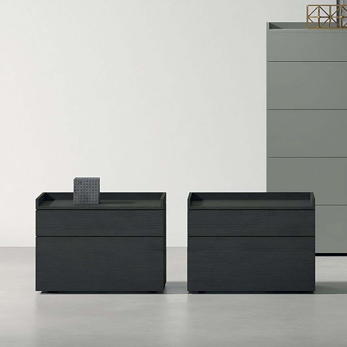 Nel comodino Sir a due cassetti il design lineare viene valorizzato dal top a vassoio: un dettaglio di stile e un originale piano d’appoggio che può essere personalizzato nella finitura.