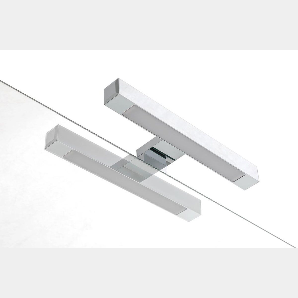 Una base sospesa laccata bianco opaco con cassetto dotato di chiusura soft-close e una maniglia in alluminaio laccata bianca; al suo fianco un cubotto in pietra naturale grigia in cui poter riporre asciugamani. Sopra alla base sospesa c'è il lavabo da appoggio in resina bianco opaco con trattamento antigoccia. Appesi sopra alla base poi ci sono uno specchio con telaio in ritiro in abs e una mensola sagomata da accostare allo specchio. Ad illuminare tutta la composizione c'è una luce a led con caratteristiche: 6000k (non sostituibile), 8W, AC220/240V, 50-60Hz, 640 Lumen, IP44, RoHS, CE, classe energetica A++