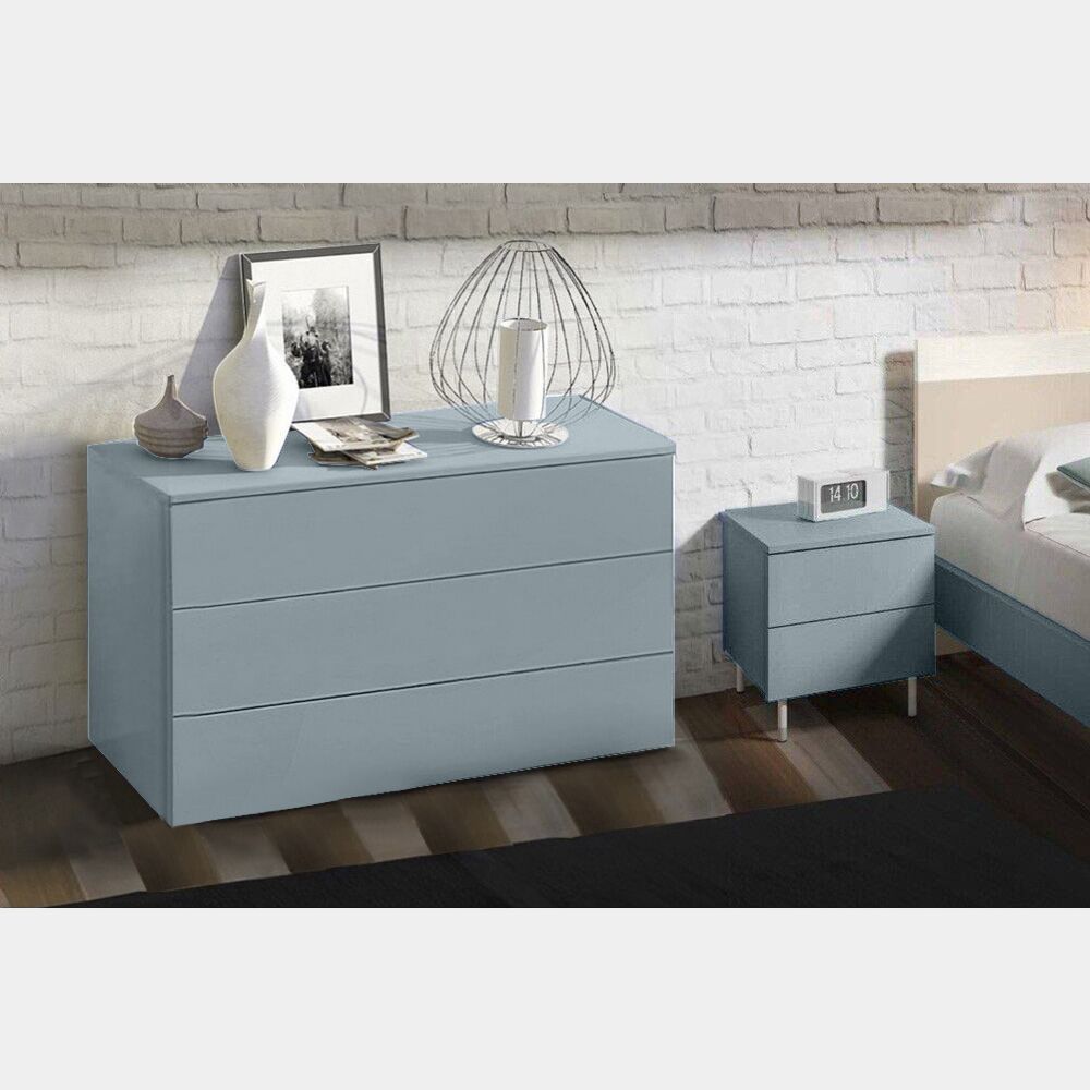 Il Comodino moderno a 2 cassetti per la zona notte è ideale per arredare la cameretta del tuo bambino, perché unisce una finitura colorata come il Blu Avio e delle linee moderne che porteranno eleganza nella stanza. Ad accostare il comodino, c'è un Comò a 3 cassetti, sempre in finitura Blu Avio. Come Optional è possibile mettere al comò dei piedini H.10 cm, mentre il comodino è disponibile anche nella versione senza piedini e nella versione con ruote.