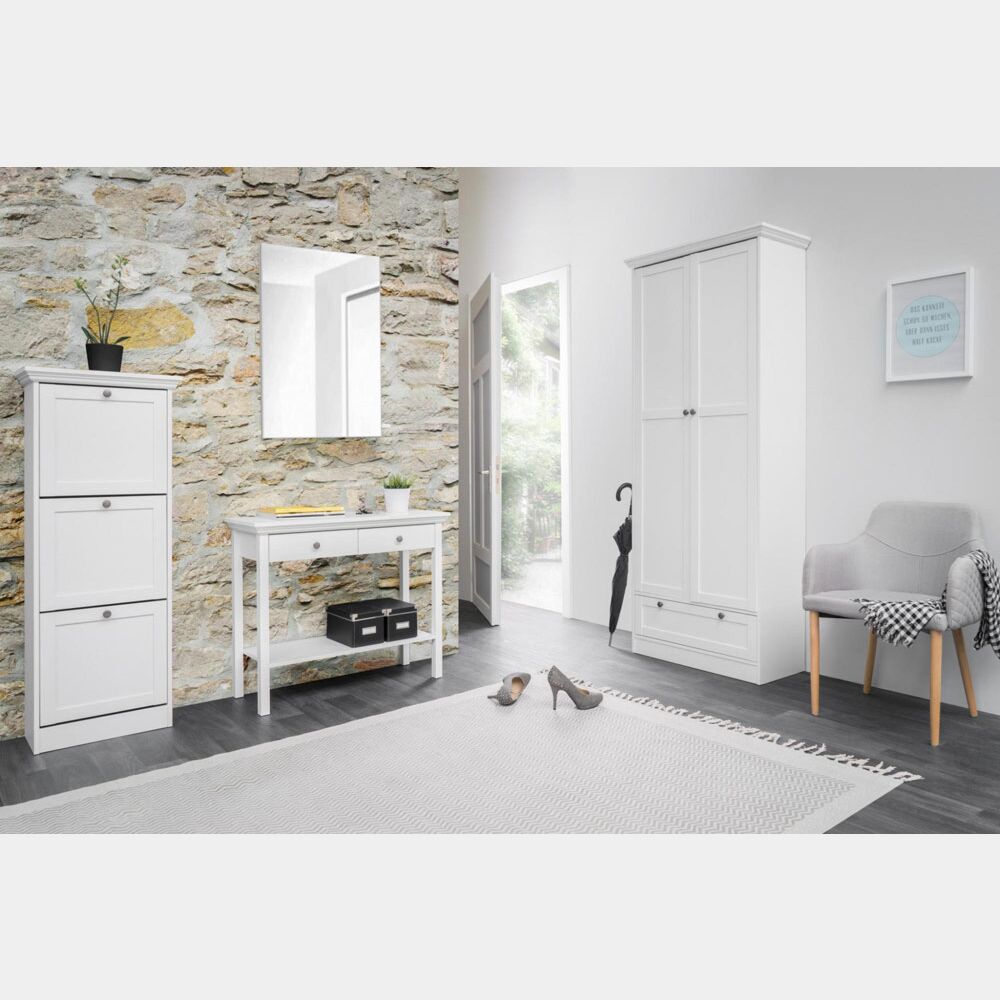 La scarpiera è in finitura bianca ed è a 3 ante con apertura a ribalta e maniglie in metallo. Può contenere 12 paia di scarpe. I bordi della madia sono rivestiti in ABS, mentre i profili sono in MDF.Consolle a 2 cassetti, finitura biancaLa Consolle per la zona giorno ha profili in MDF e bordi in ABS ed è interamente in melaminico con 2 maniglie in metallo.