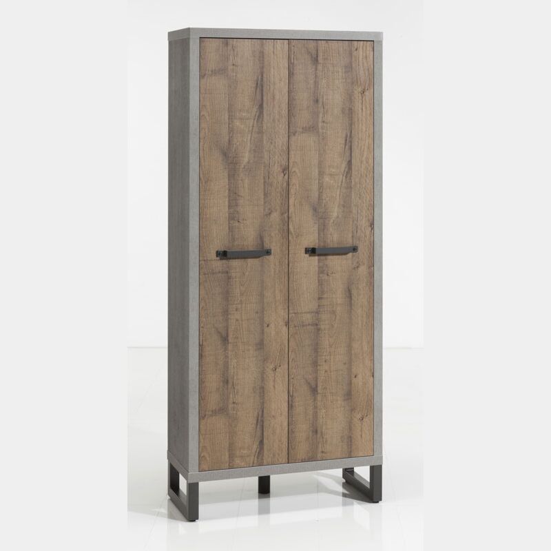 L'arredo da ingresso industry, 2 ante, colore cemento e rovere invecchiato ha uno spessore dei pannelli è di 38 mm, i piedi laterali in metallo misurano 15 cm.