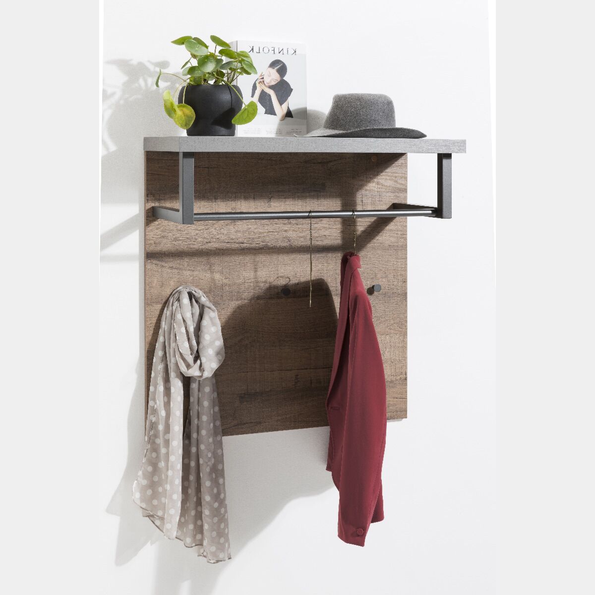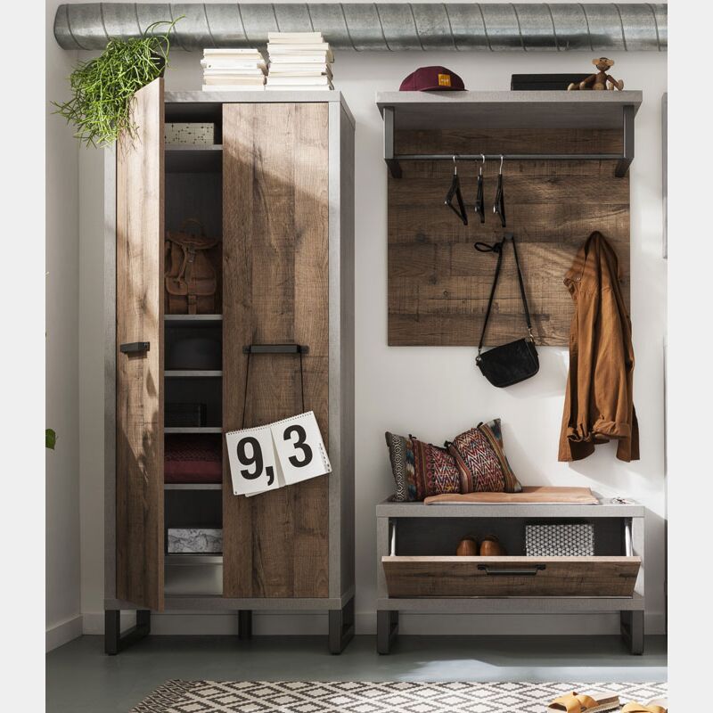 Composizione d'ingresso Industry con Armadio e Panca, Cemento e Rovere invecchiato
