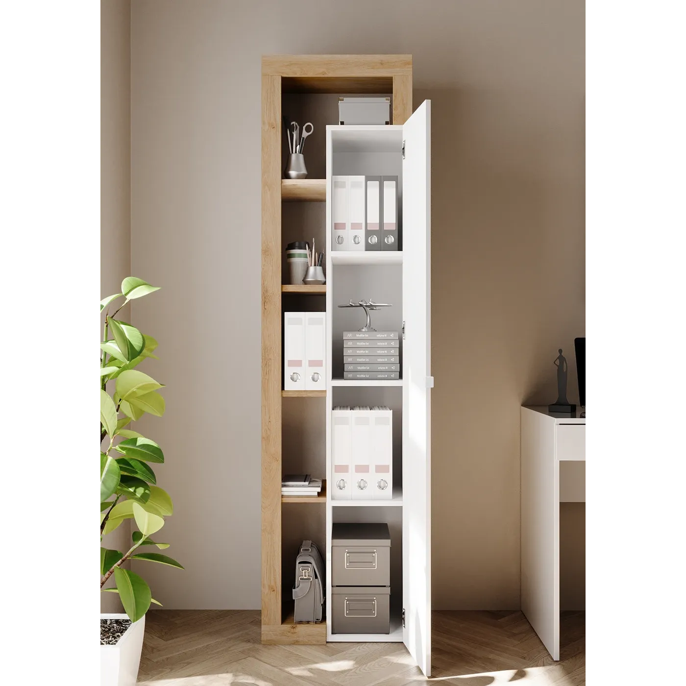 Composizione da ufficio o per una cameretta che presenta una scrivania ad 1 cassetto e con 2 ripiani e 2 vani a giorno; assieme è presente una colonna ad un'anta e 7 ripiani.