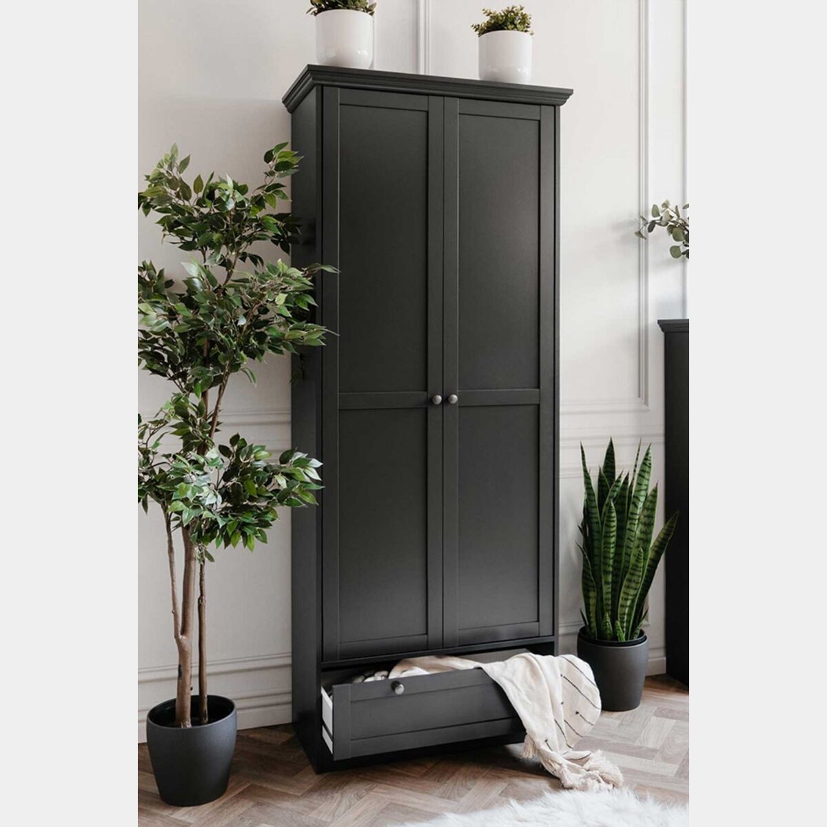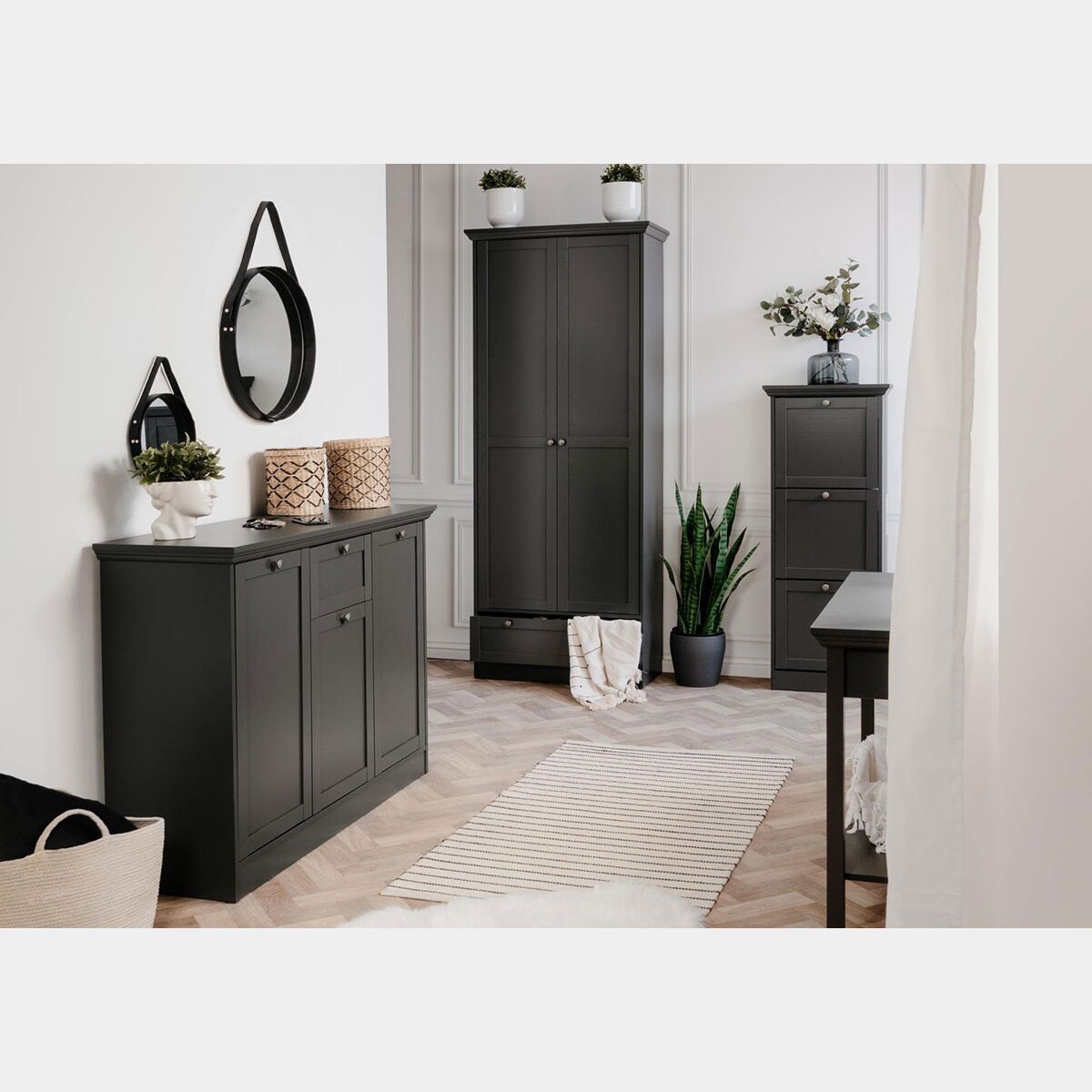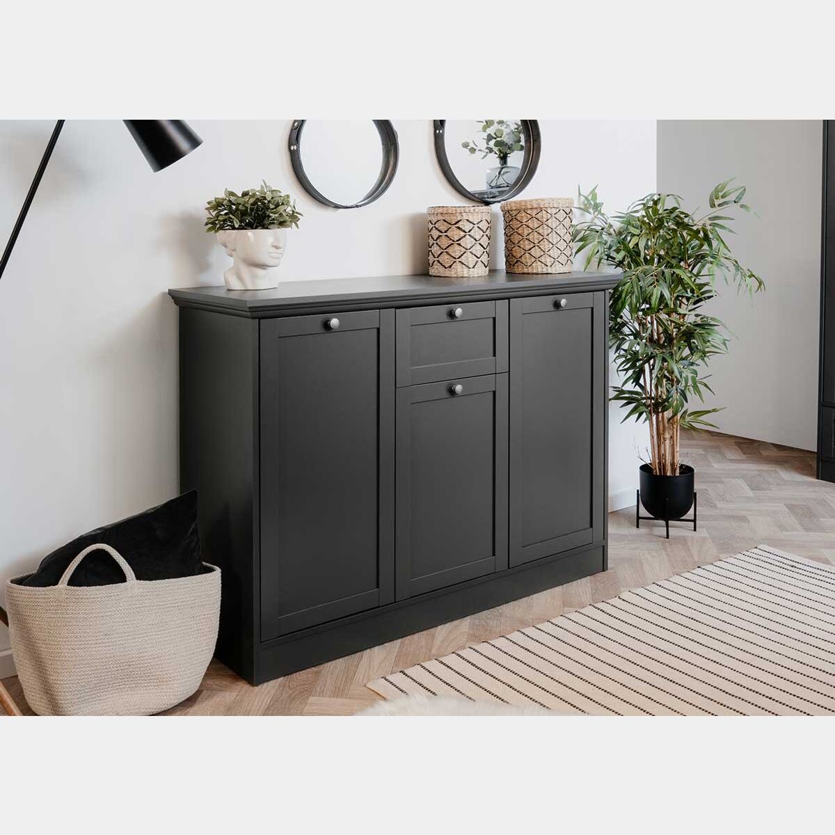 La composizione scandinava in finitura grigio antracite viene a completarsi per l'unione di più componenti: consolle, scarpiera, guardaroba da ingresso e madia.