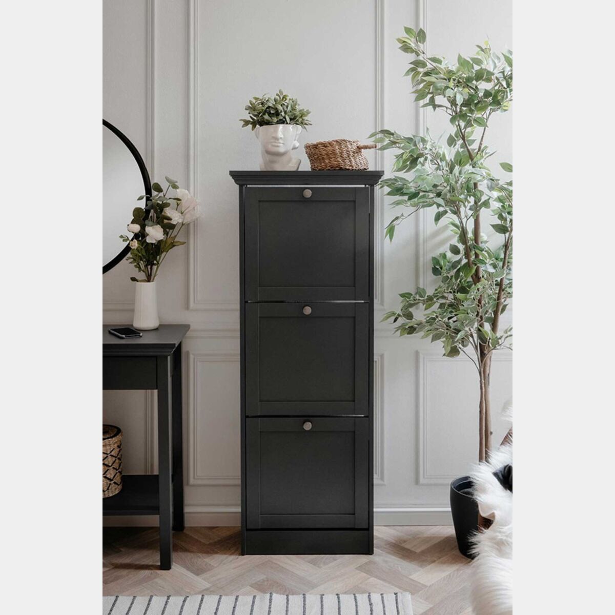 Per la resa ancora più unica ed efficiente della composizione, alla consolle è stata affiancata la capiente scarpiera a tre sportelli con doppia profondità dove poter introdurre le proprie amate scarpe in tutta comodità. Nonostante l'ampio spazio offerto dal complemento d'arredo, le sue misure rendono la scarpiera adatta anche a zone dalle misure molto ridotte.