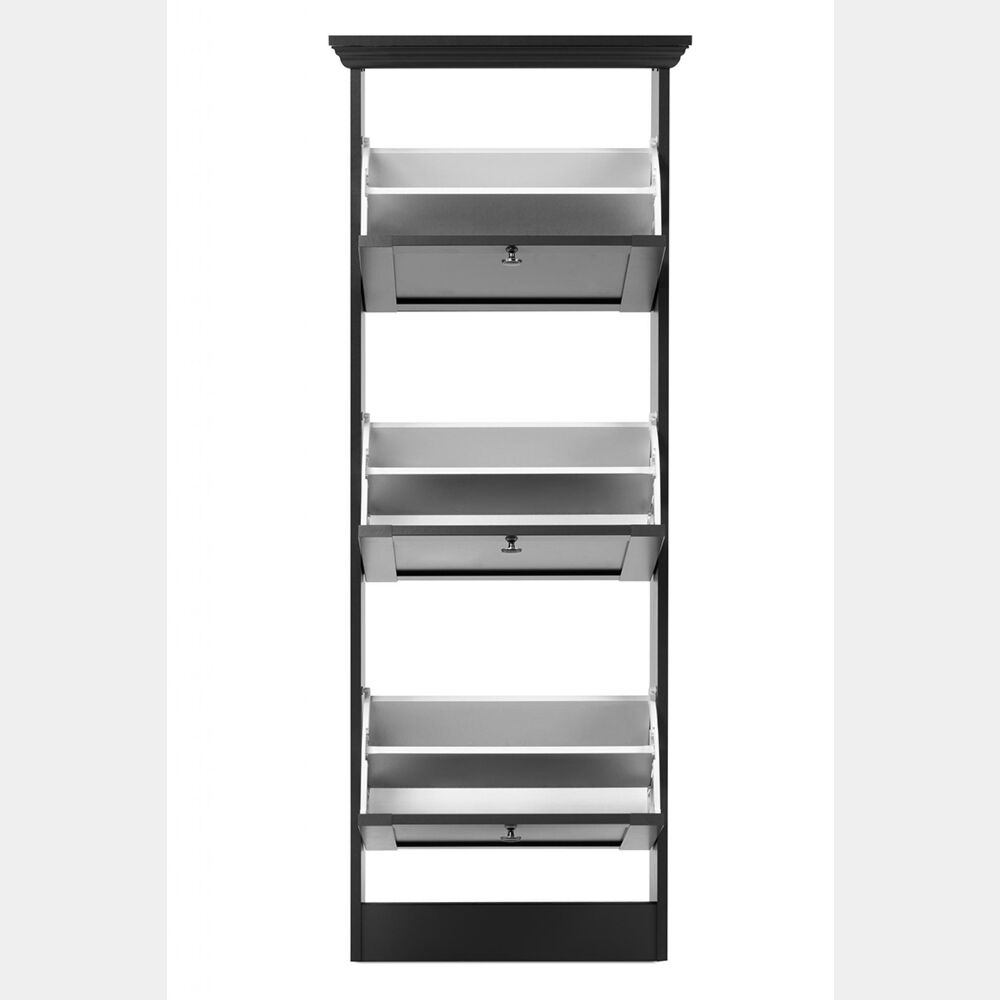 Per la resa ancora più unica ed efficiente della composizione, alla consolle è stata affiancata la capiente scarpiera a tre ante con doppia profondità dove poter introdurre le proprie amate scarpe in tutta comodità. Nonostante la'mpio spazio offerto dal complemento d'arredo, le sue misure rendono la scarpiera adatta anche a zone dalle misure molto