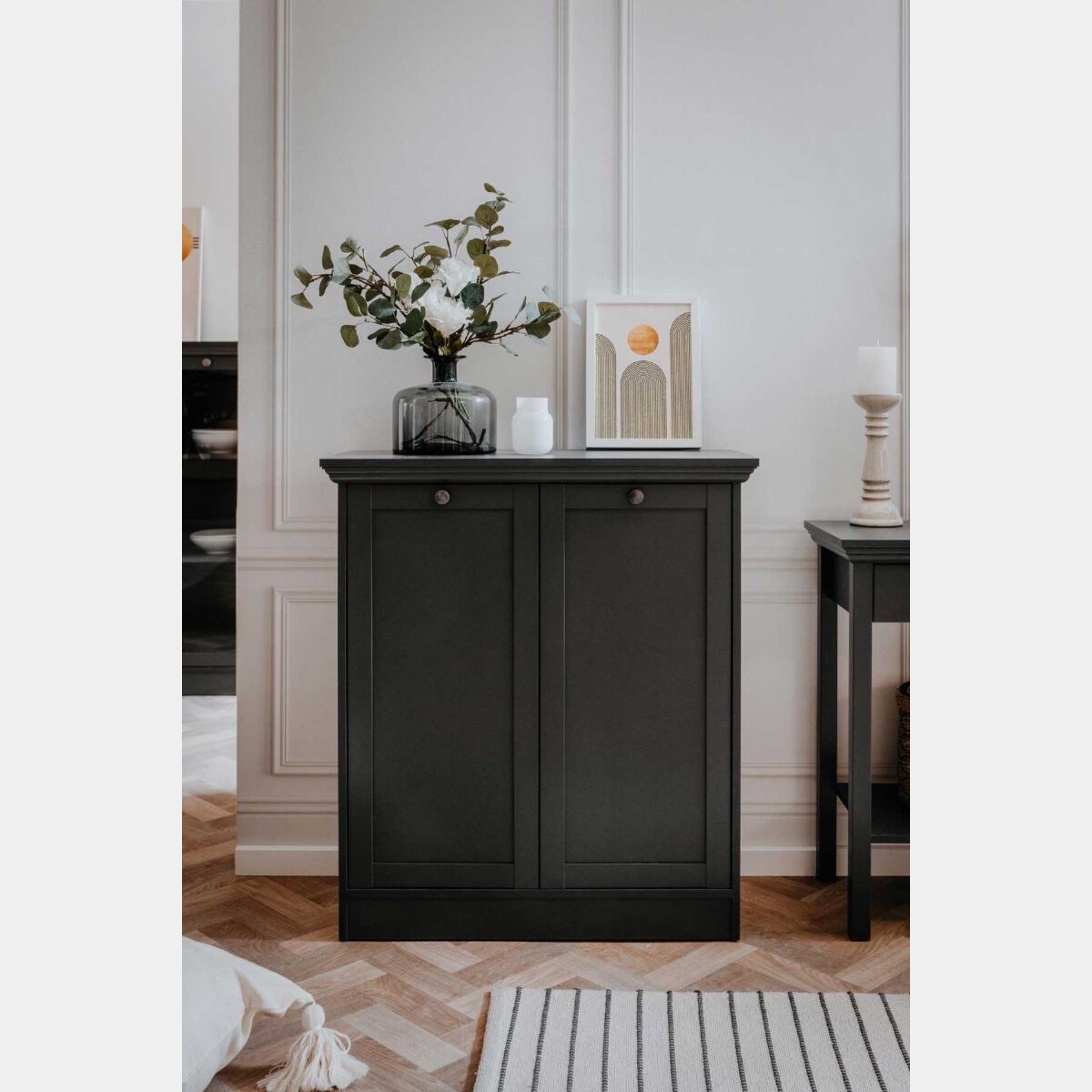 L'accesso della propria abitazione viene arrichito inoltre dall'idea di aggiungere ai due elementi precedentemente descritti una madia a due ante dalle linee più formali, adattandosi bene ai contesti più classici. Le linee genuine che distinguono la madia rendono possibile l'inserimento dell'articolo in contesti differenti come un disimpegno, un soggiorno o una cucina. La credenza a due ante al suo interno prevede un ripiano orizzontale che suddivide il vano in due zone separate per ottimizzare lo spazio organizzandolo in maniera più che disciplinata.