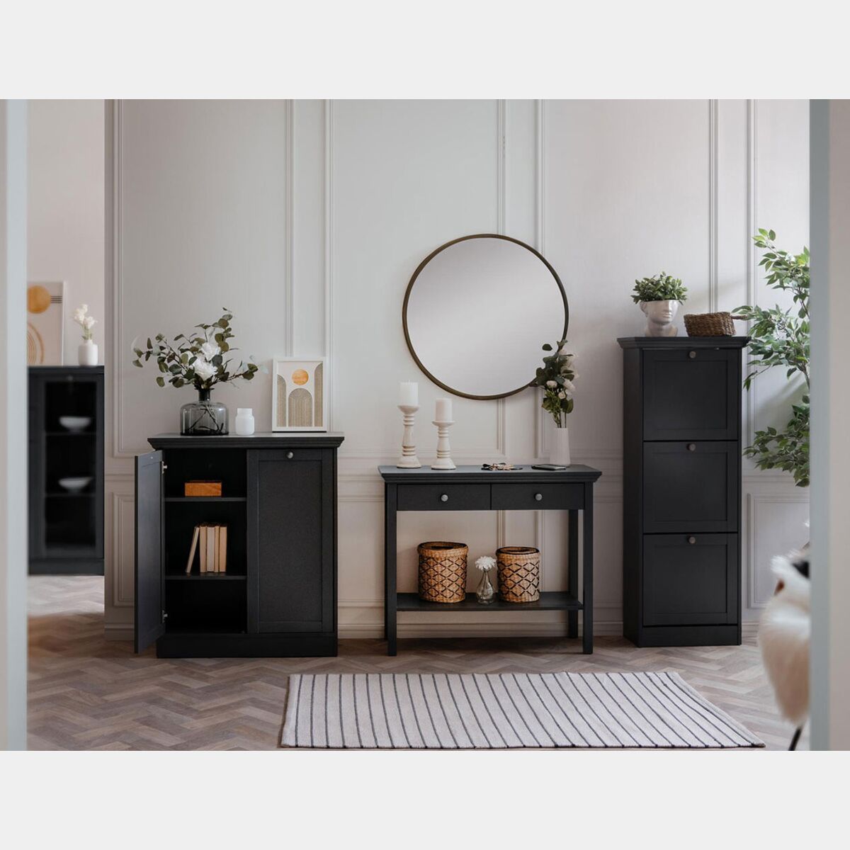 La composizione scandinava in finitura grigio antracite vede la conciliazione di un perfetto tris di complementi: consolle, scarpiera e madia.