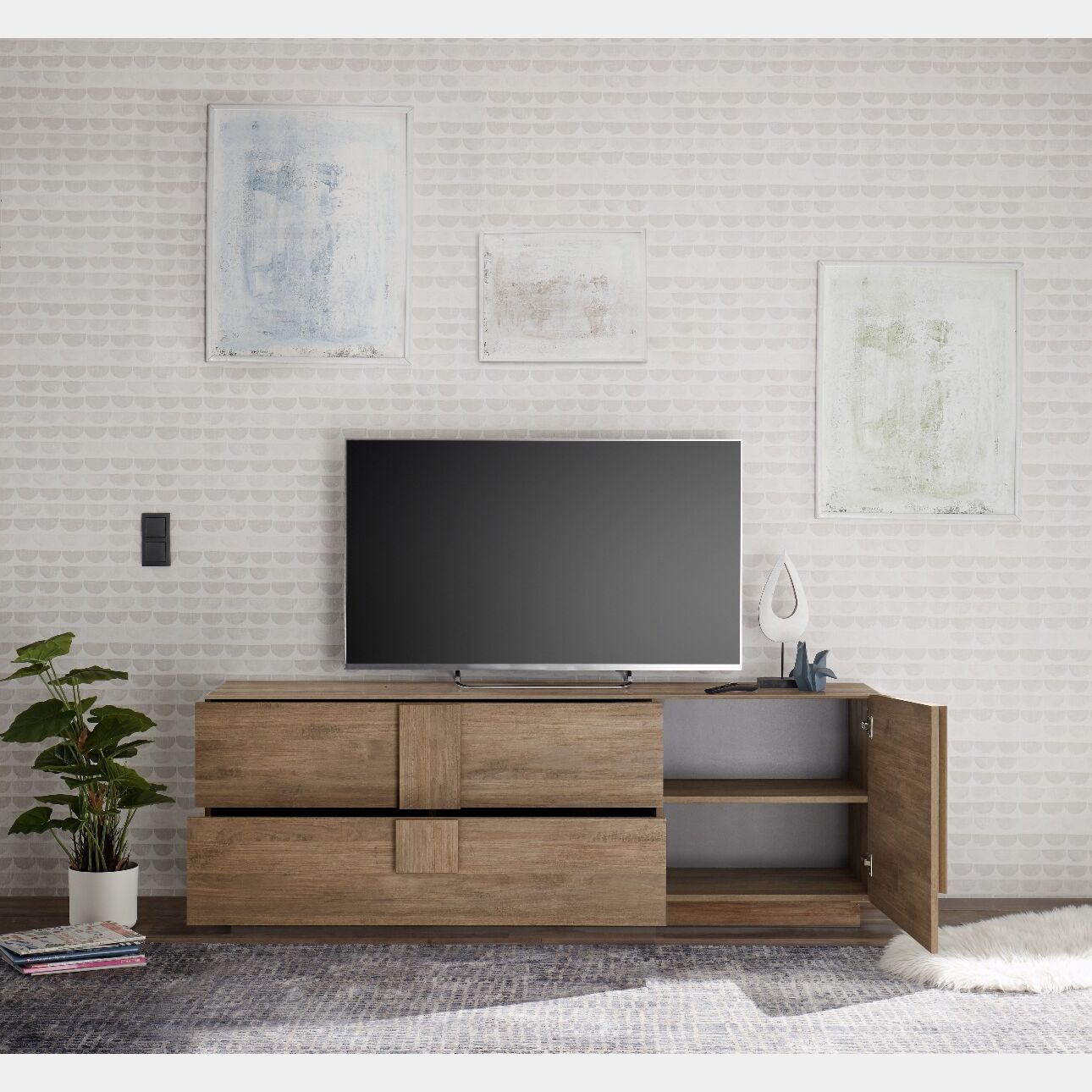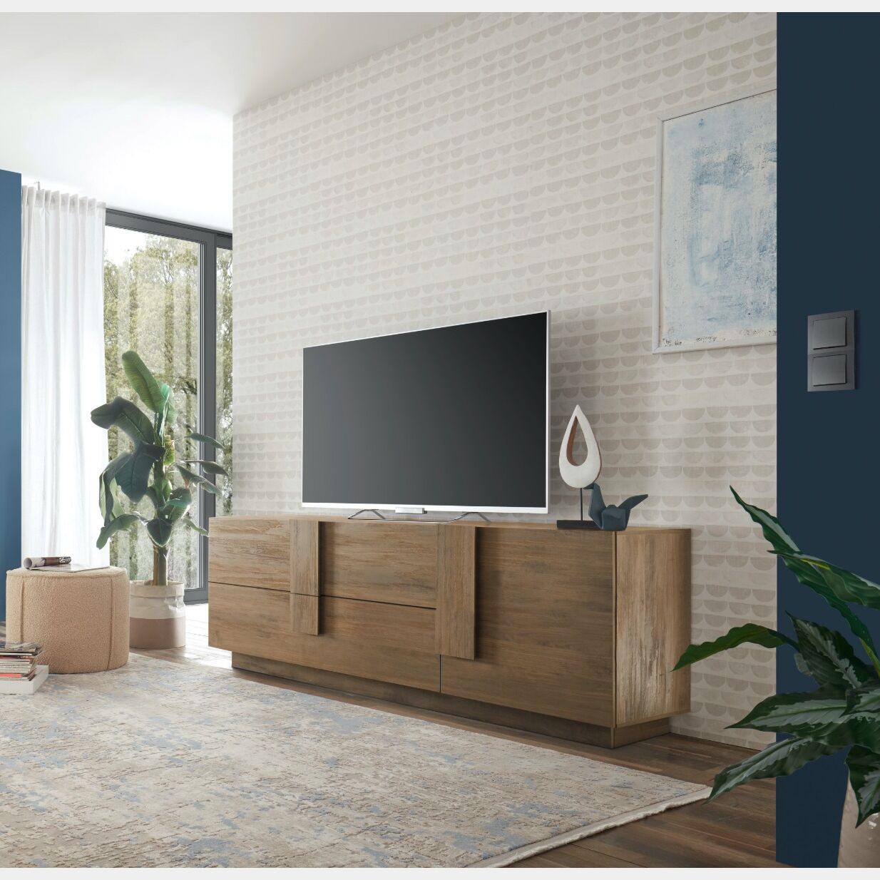 Il mobile tv è dotato di due capienti cassetti ed un'anta: suddivisione che assicura un ampio piano di appoggio per oggetti della televisione e non solo. Il porta tv è inoltre disponibile in Bianco laccato lucido.