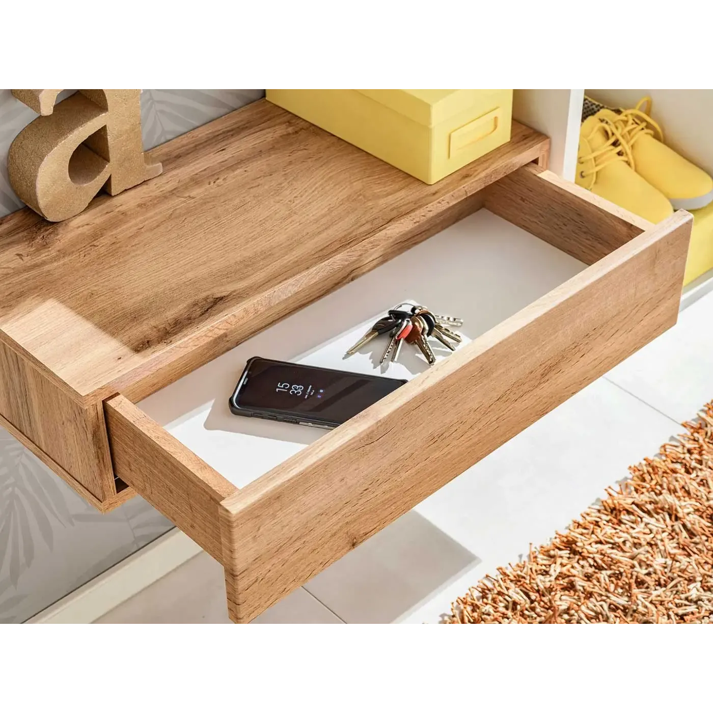 Questa soluzione d'arredo è stata ideata per la decorazione dell'ingresso della casa e comprende un cubo senza anta e una mensola che possiede anche un cassetto estraibile.