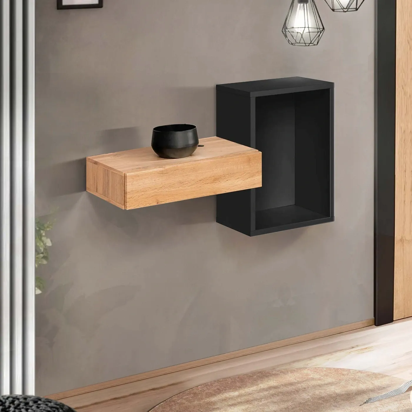 Una composizione da appendere a muro con un cubo aperto e una mensola con un cassetto. Il primo pezzo è di color Nero mentre il secondo è in Rovere wotan.