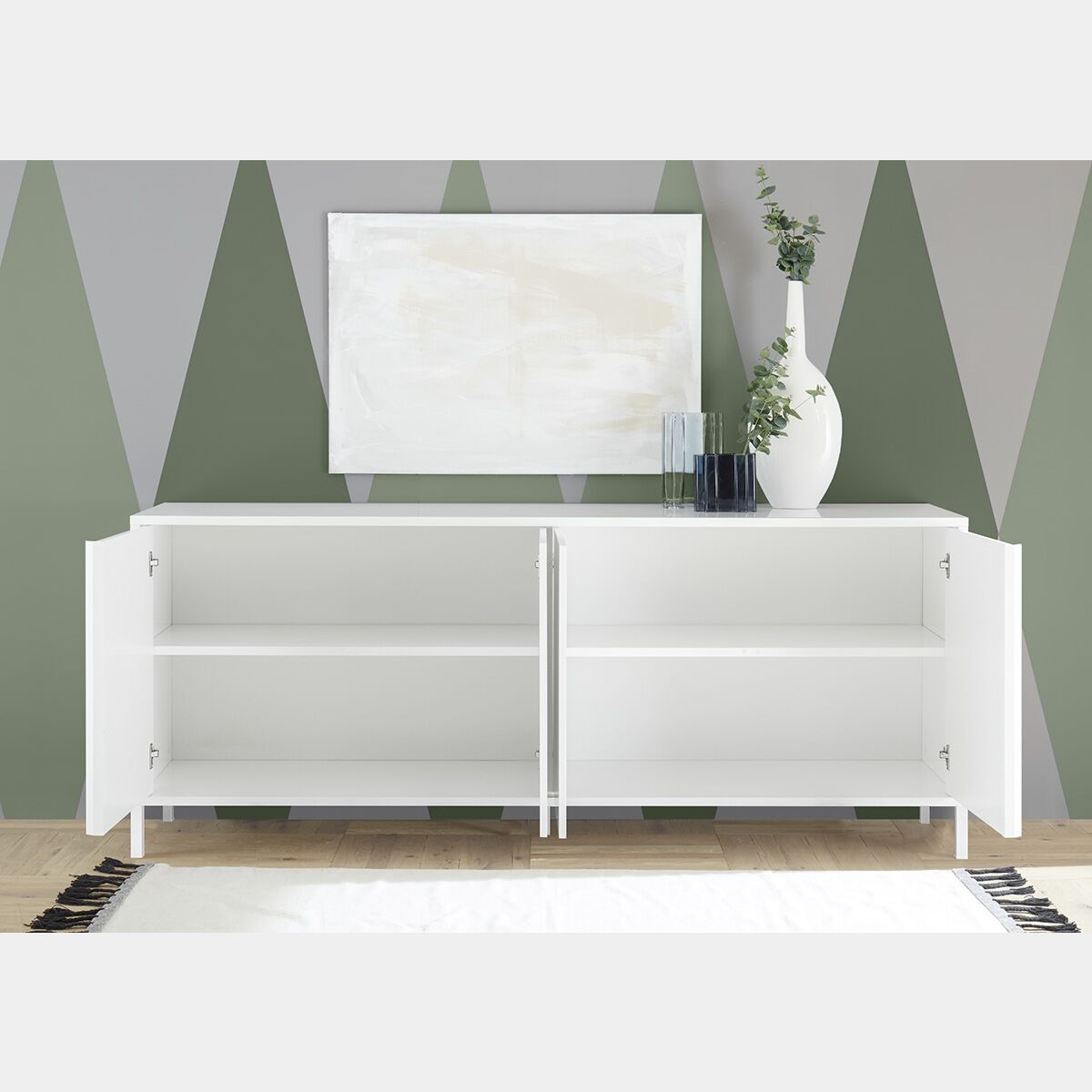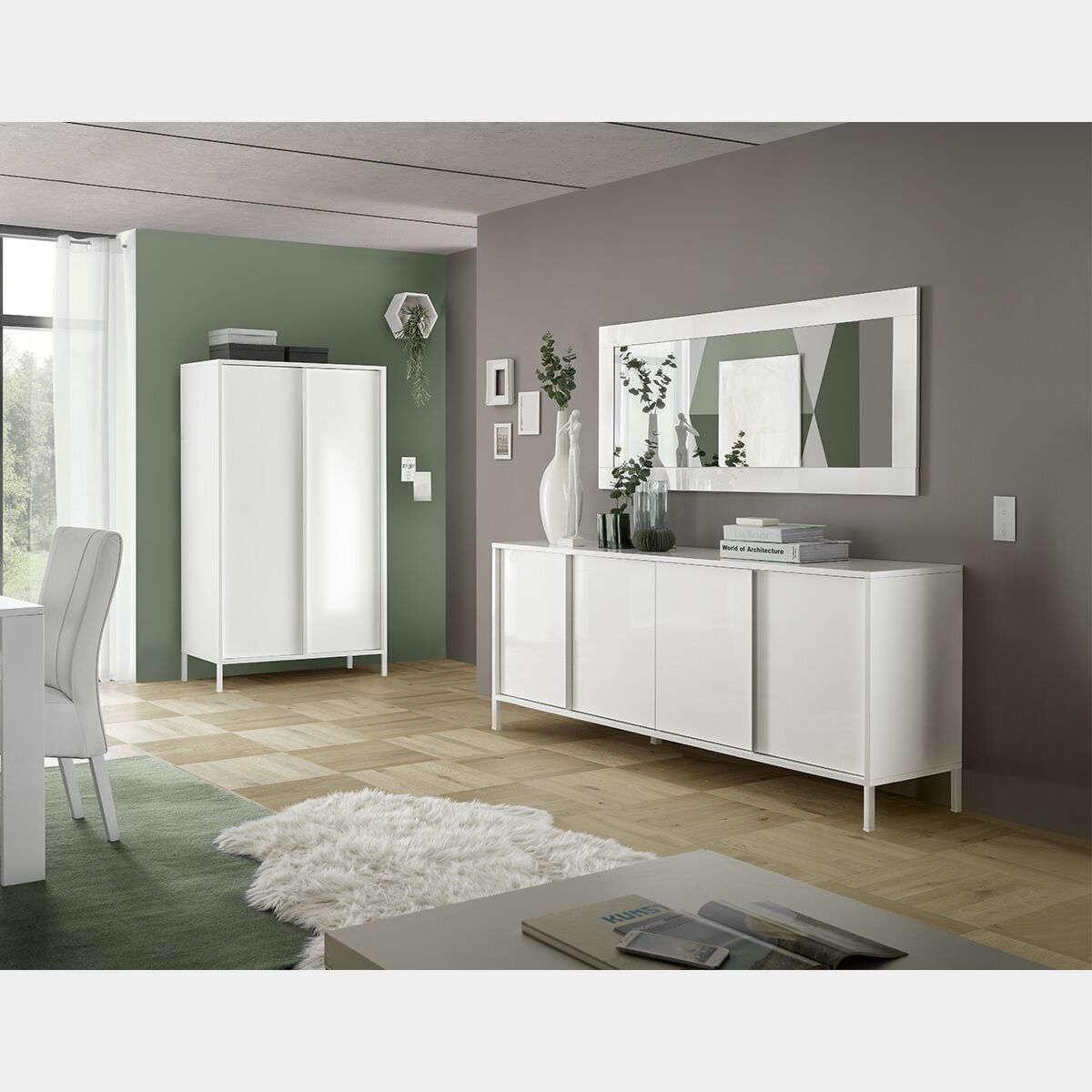 La sala da pranzo moderna ideata per la nuova collezione "Mobili Leg" di Zenzero Shop unisce la finitura Bianco Laccato Lucido con una struttura dallo stile minimal e moderno che si accosta molto bene a qualsiasi tipo di arredamento moderno, classico o industriale. La composizione per zona giorno è formata da 1 madia contenitore, 1 madia 4 ante.