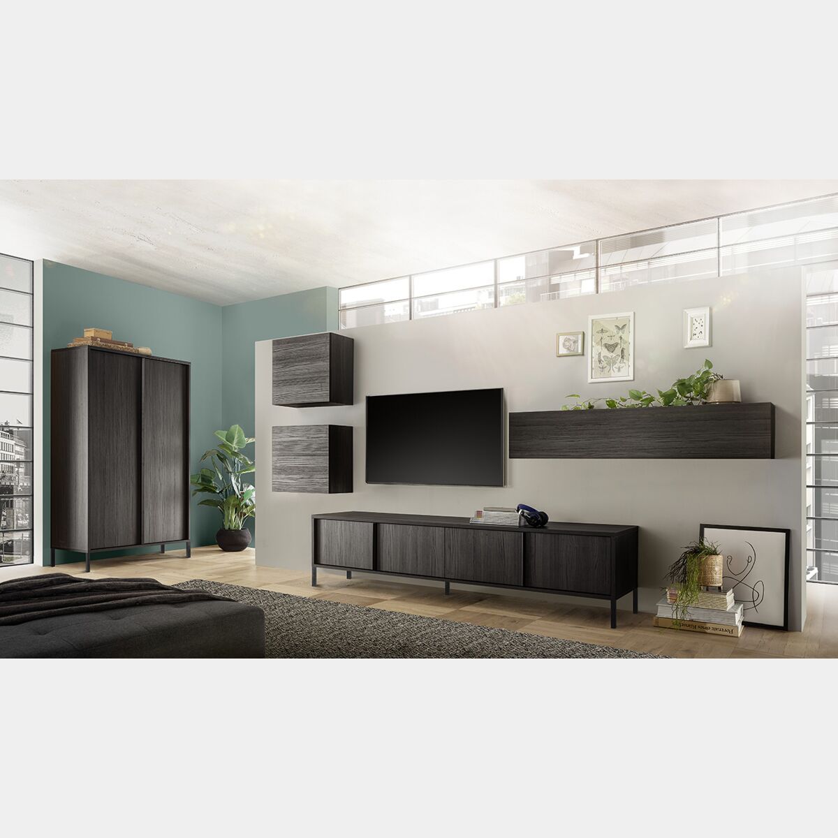 La madia contenitore per cucine è dotata di due ante battenti, che una volta aperte mostrano un interno dal colore grigio scuro e spazioso, ben suddiviso da 3 ampi ripiani utili per riporre qualsiasi oggetto di uso quotidiano. Il porta tv invece è dotato di 4 ante battenti rifinite da delle maniglie in design nero. Appesi al muro invece ci sono 2 cubi ad anta battente con all'interno un ripiano. A completare la parete c'è un pensile con apertura a ribalta / vasistas da posizionare a piacere sopa la tv.