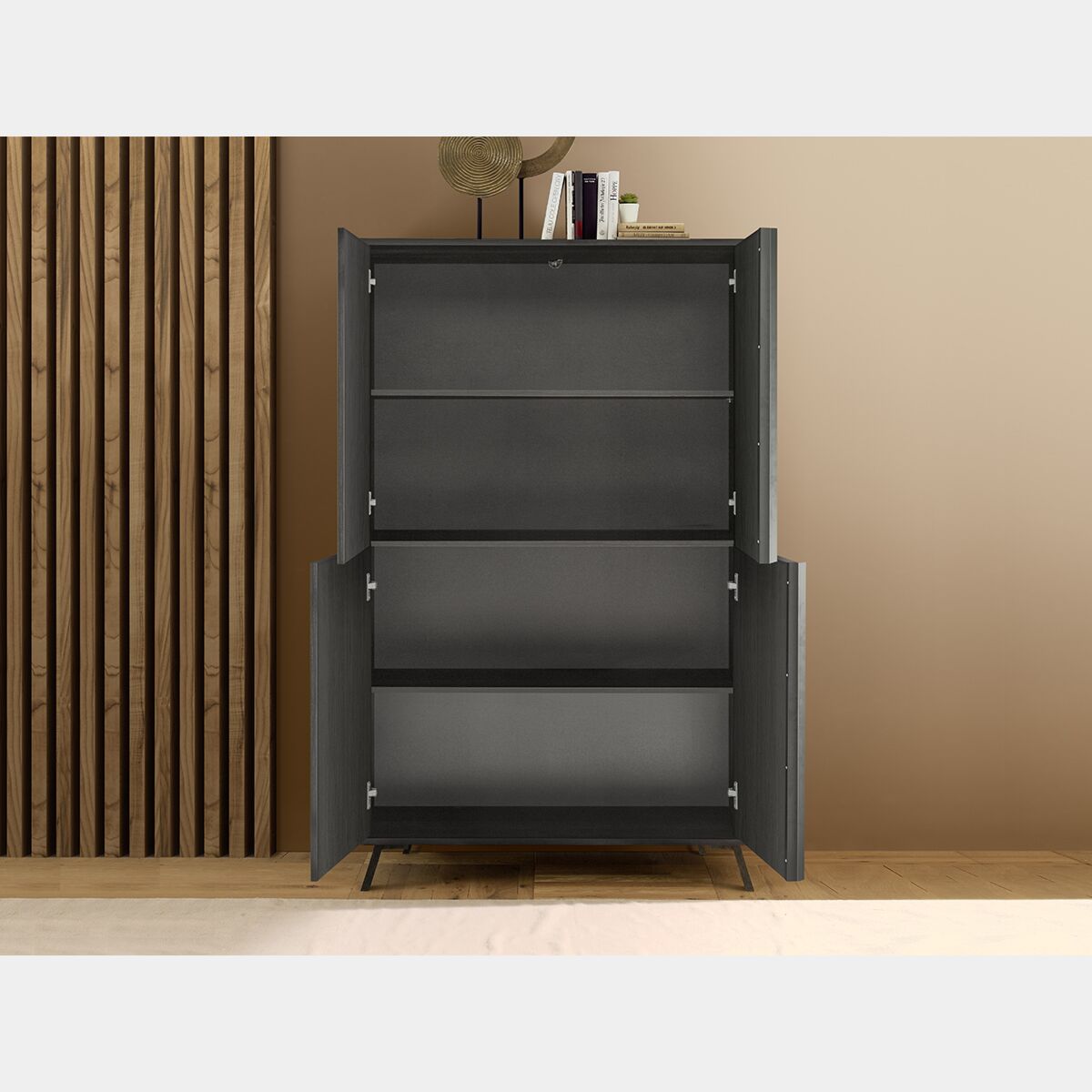 La madia a 4 ante battenti proposta da ZenzeroShop unisce la finitura nero frassinato con una struttura dallo stile minimal e moderno che si accosta molto bene a qualsiasi tipo di arredamento moderno, classico o industriale. Le 4 ante una volta aperte con delle maniglie dal design nero mostrano l'interno grigio scuro e le 2 mensole su cui disporre la propria oggettistica.