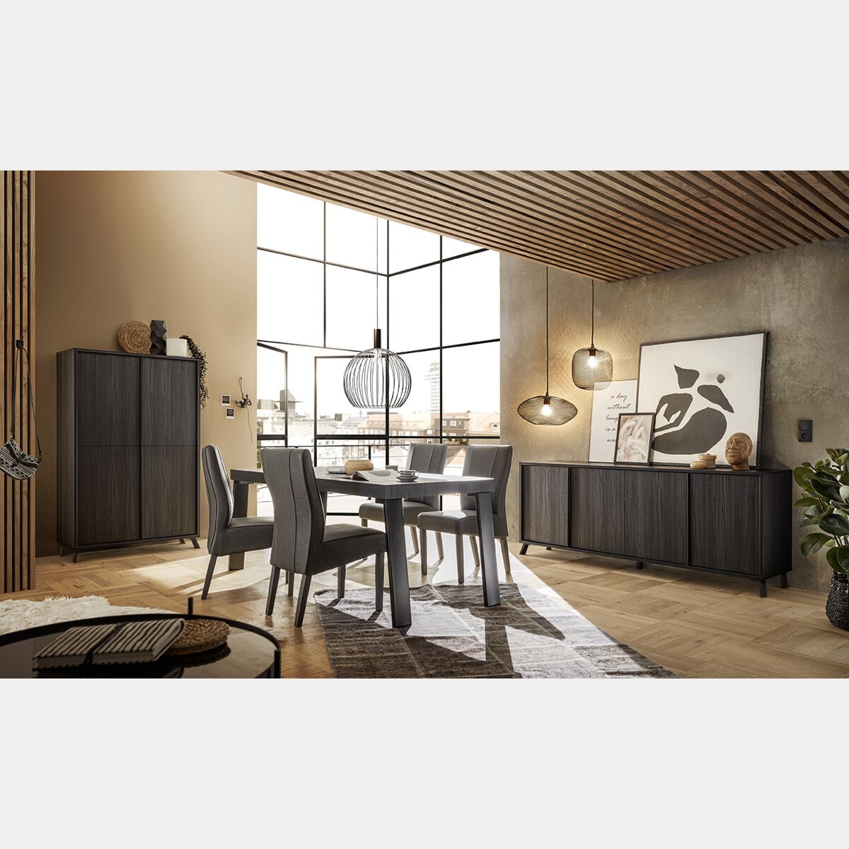 La sala da pranzo di design, in finitura Nero Frassinato è composta da: 1 tavolo, 1 madia contenitore e madia 4 ante.