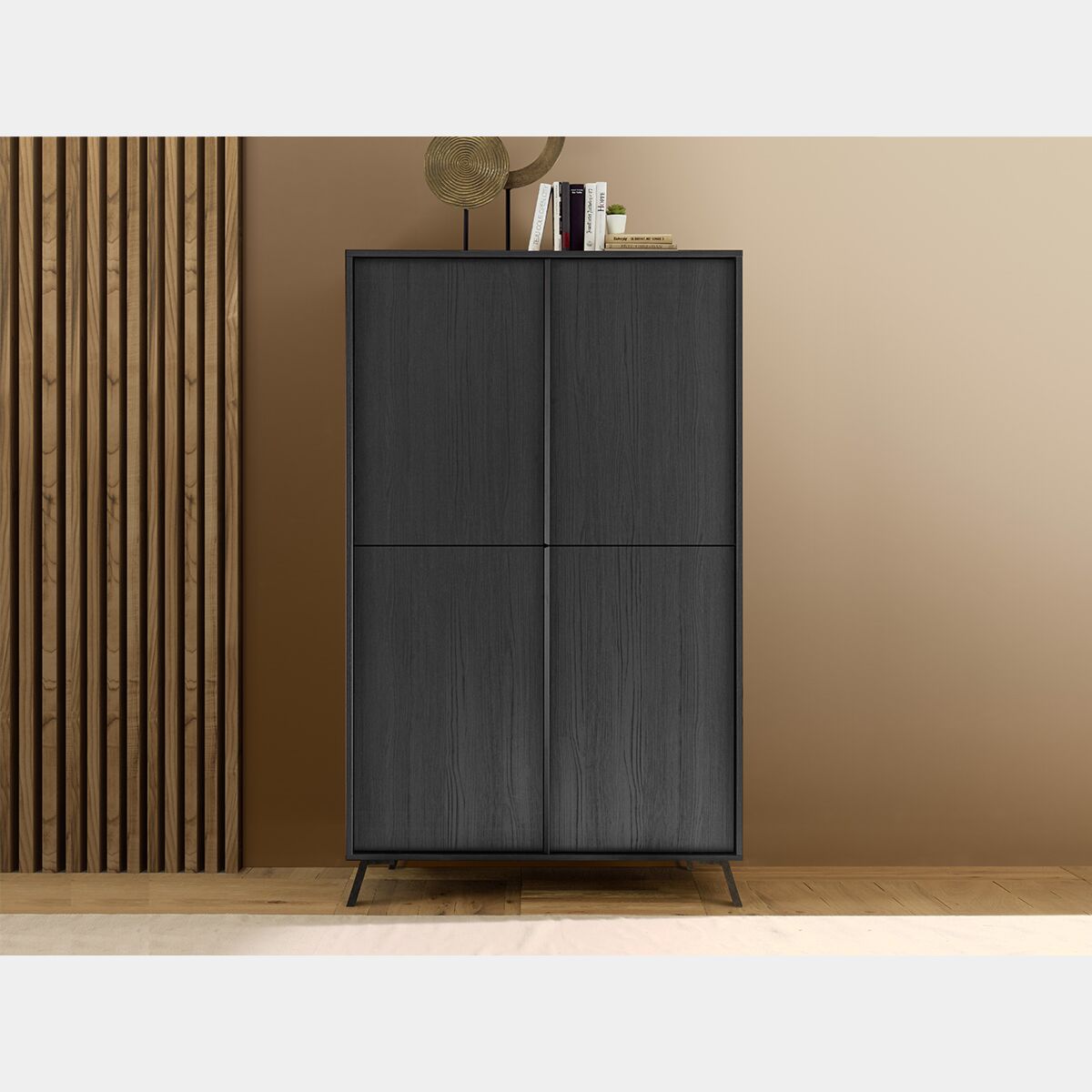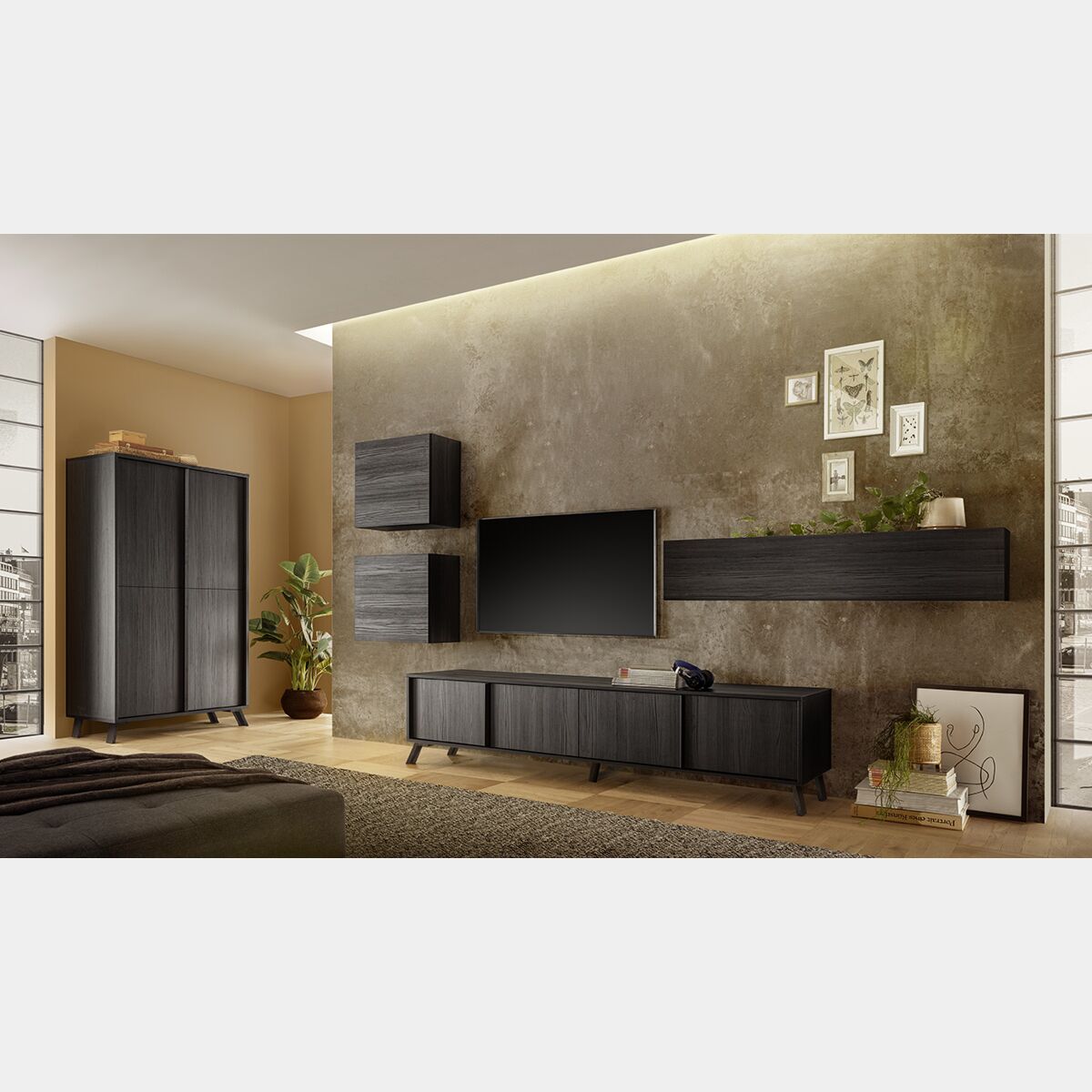 La composizione di design, in finitura Nero Frassinato è composta da: 1 base TV, 1 madia contenitore, 1 pensile sospeso e 2 cubi.