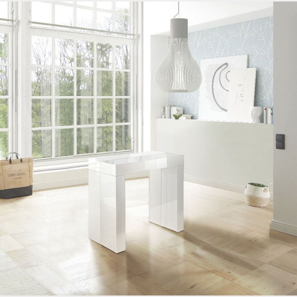 La consolle dalle linee moderne, si trasforma facilmente in un tavolo per rispondere ad esigenze differenti in ogni occasione garantendo inoltre il massimo grado di comodità per i nostri ospiti. La consolle è rivestita in ogni sua parte del bianco lucido, elemento ideale per arricchire ambienti in stile contemporaneo e zone living moderne regalandoci contestualmente più luminosità. L'articolo viene proposto inoltre come ottima soluzione salvaspazio per soggiorni o cucine di dimensioni contenute ma anche come mobile per un ingresso.