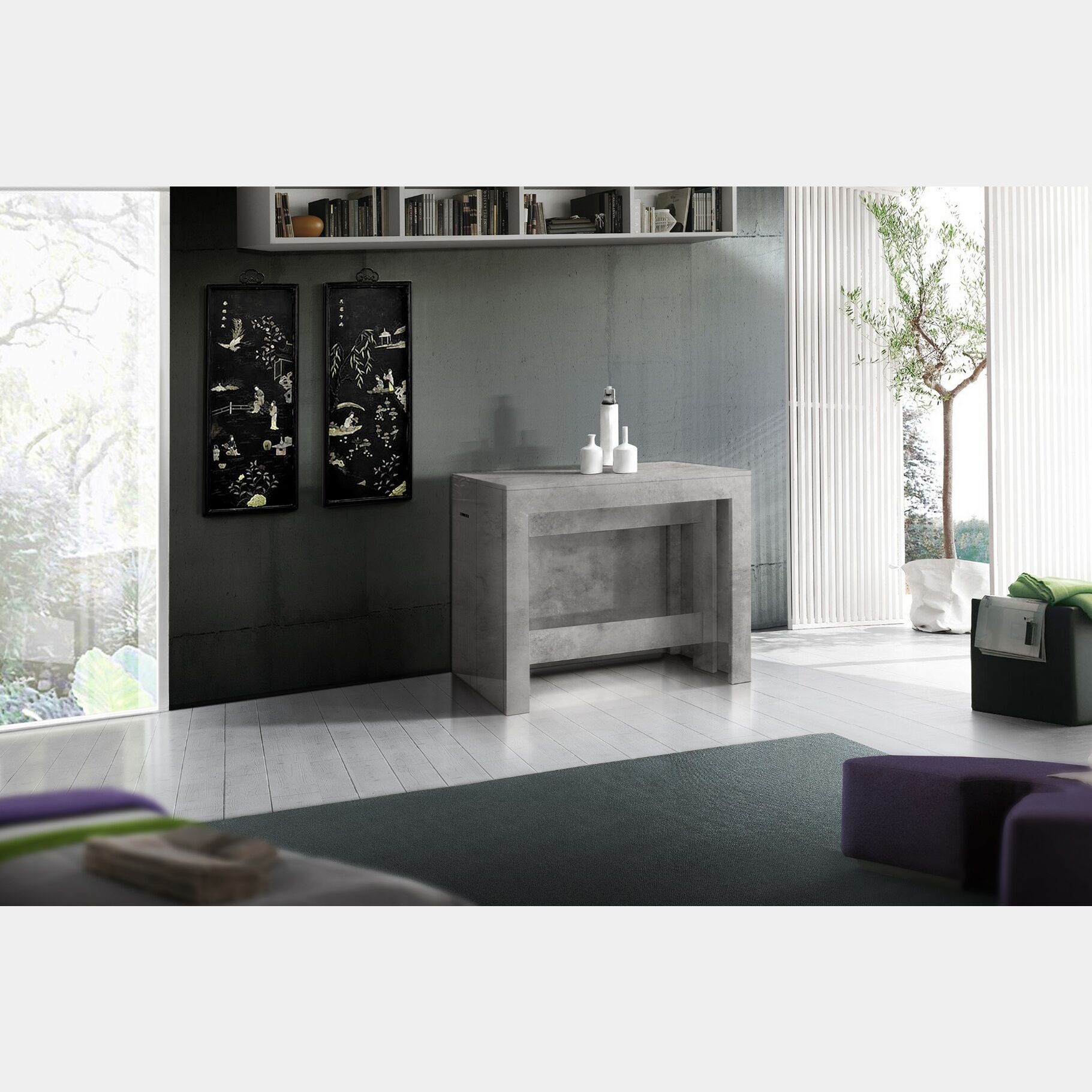 La consolle presenta una finitura in Cemento, colore di tendenza pensato per ambienti nuovi e moderni, è disponibile anche nella versione Ardesia, Bianco frassino, Pero, Olmo e Bianco lucido.