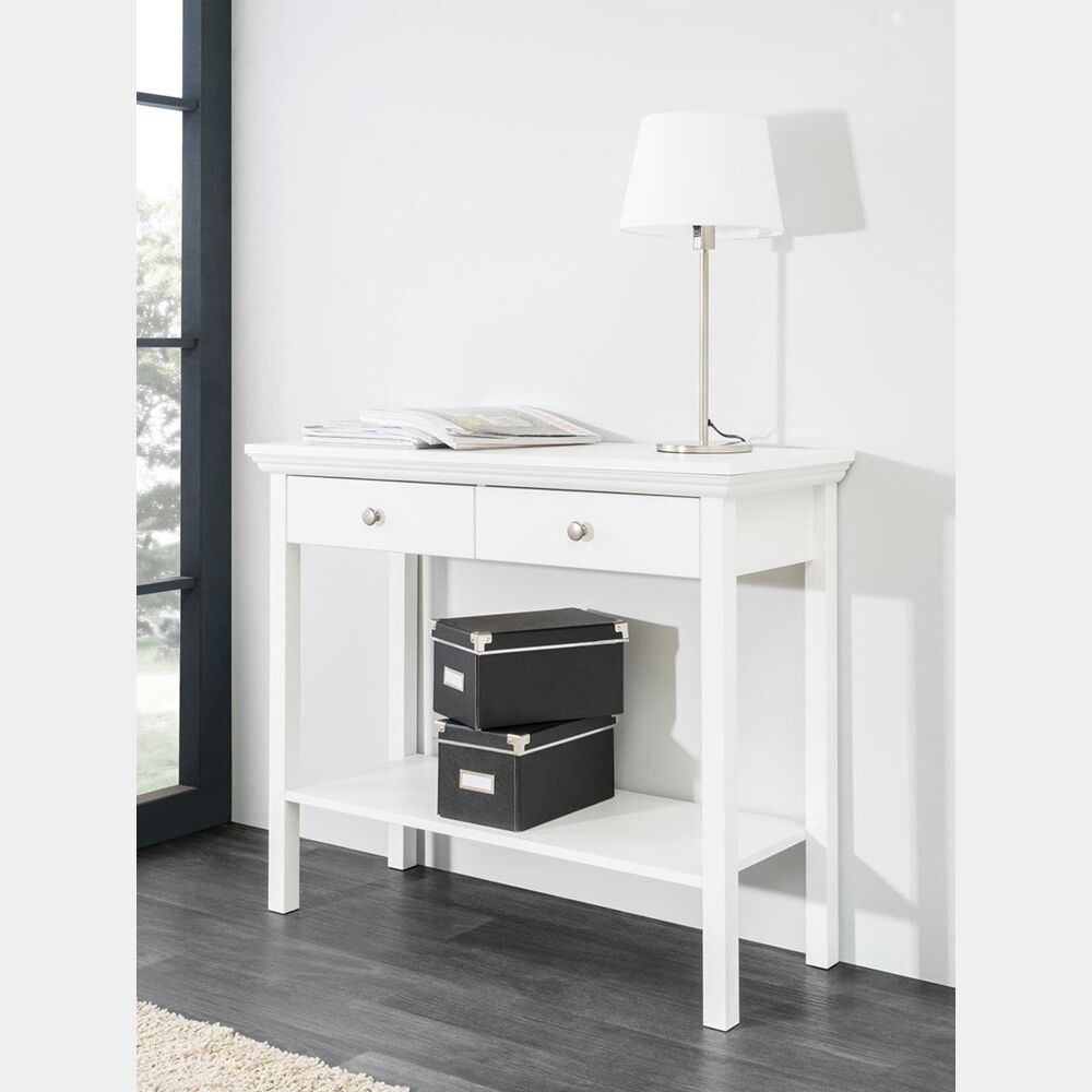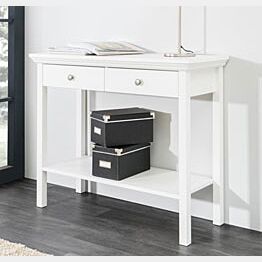 Consolle a 2 cassetti, finitura biancaLa Consolle per la zona giorno ha profili in MDF e bordi in ABS ed è interamente in melaminico con 2 maniglie in metallo.