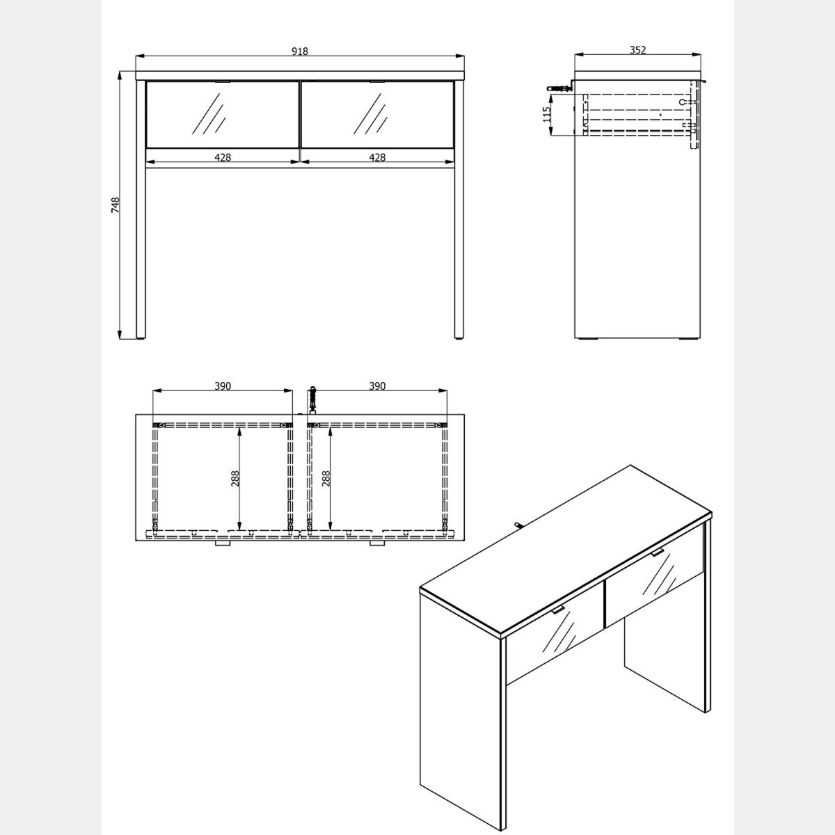 La consolle è dotata di due cassetti con sottile maniglie in materiale plastico, la struttura in Rovere presenta sfumature irregolari che assicurano alla consolle uno stile elegante e moderno, donando all'ambiente luce e calore. I frontali dei cassetti sono in vetro grigio, tonalità di grande tendenza che rende la consolle ideale per ambienti nuovi ed eleganti.