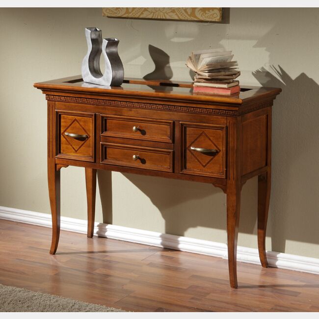 Consolle con bacheca finitura Bassano e gambe a sciabola con 4 cassetti portaoggetti, elegante e di pregio, potrà contenere i vostri piccoli tesori.