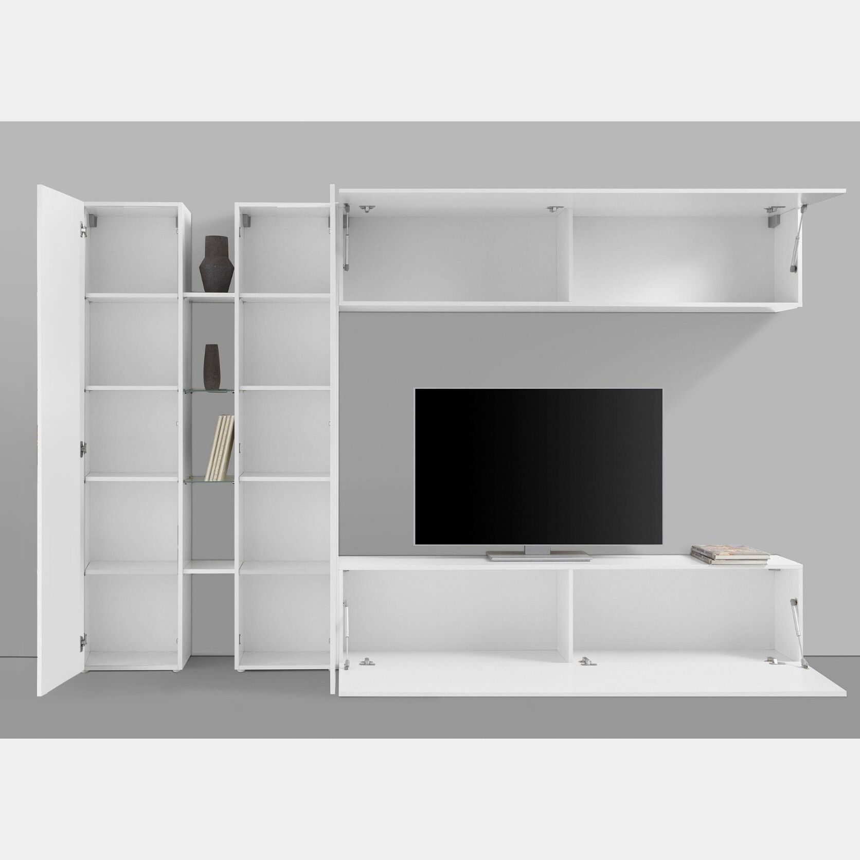 Conveniente e funzionale Parete attrezzata L.280 cm, finitura Bianco lucido