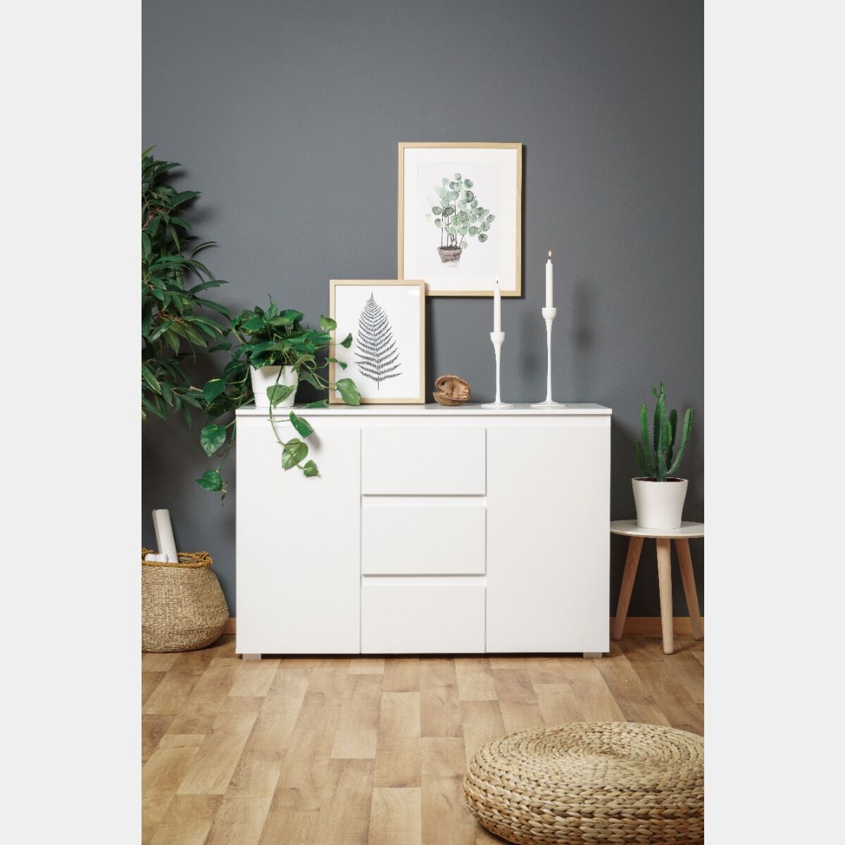Linee pulite, design minimale e finitura bianca opaca sono le caratteristiche principali della credenza, la quale si rivela non solo un mobile contenitore, ma anche un oggetto d'arredo.