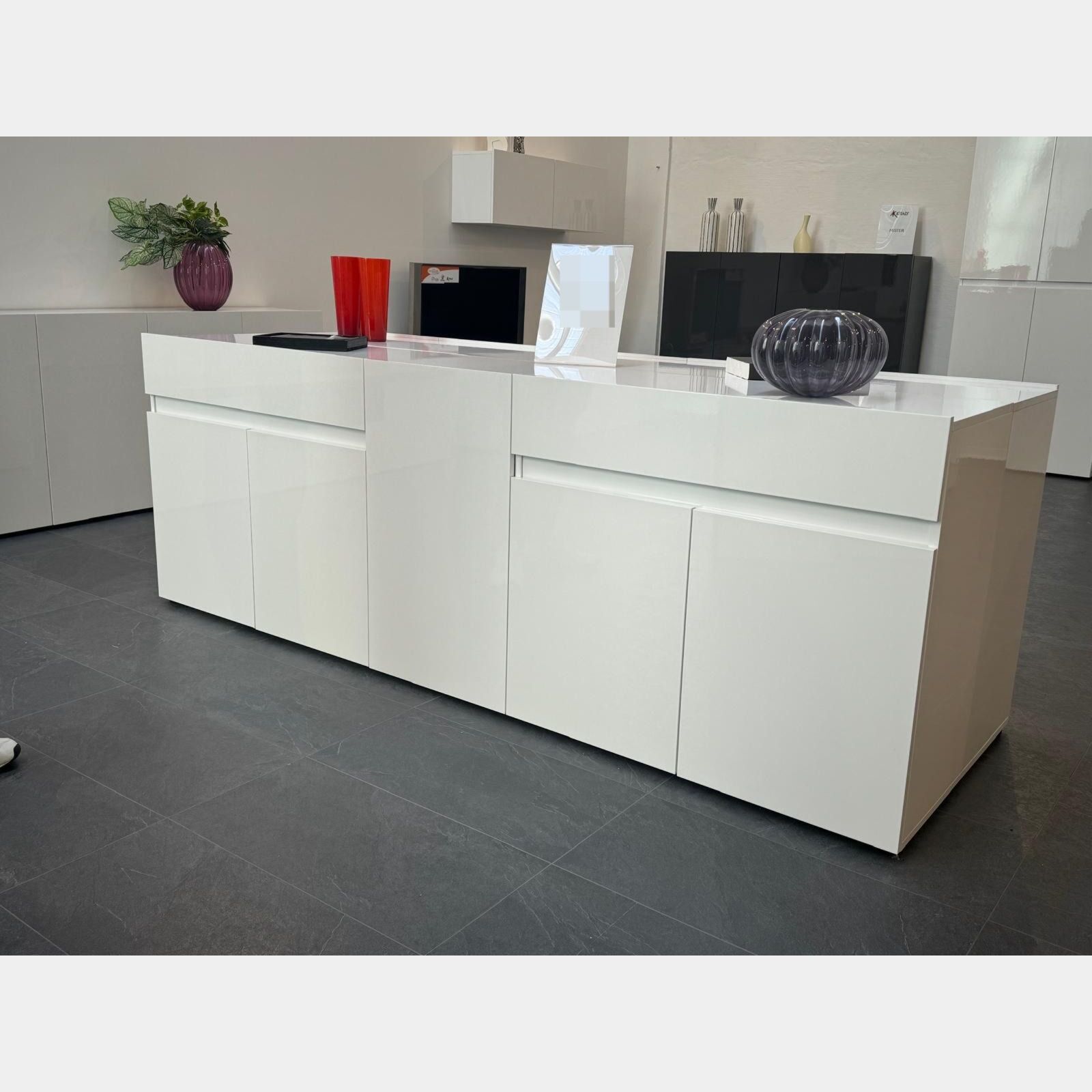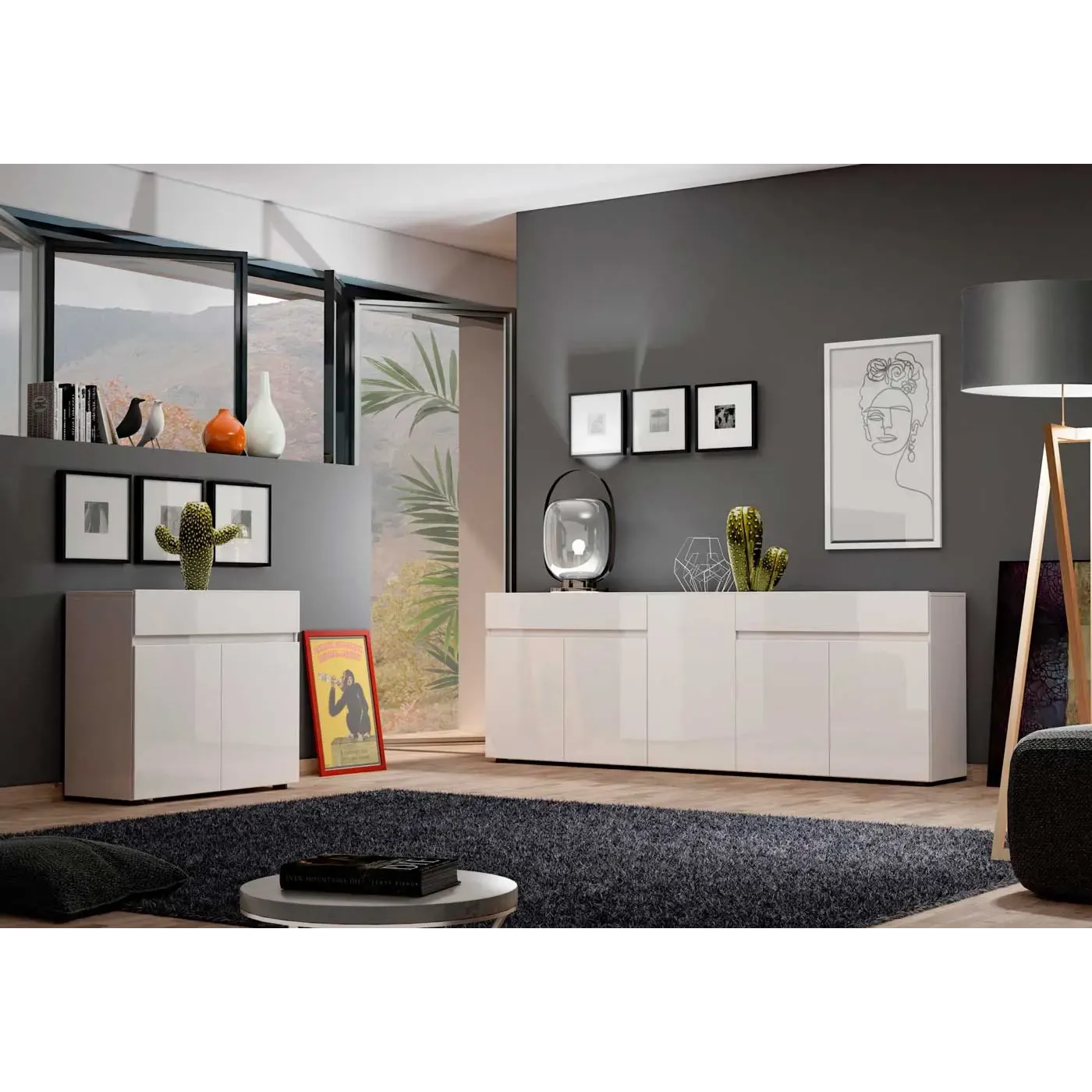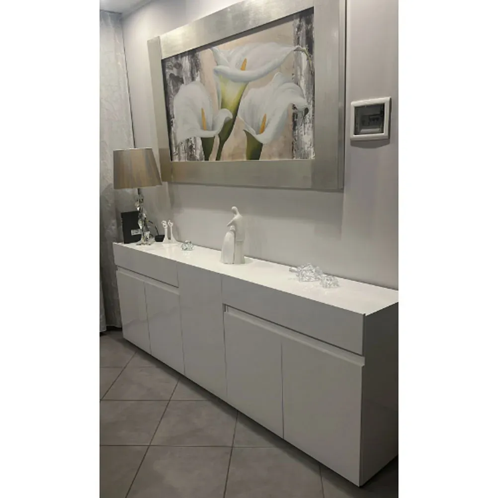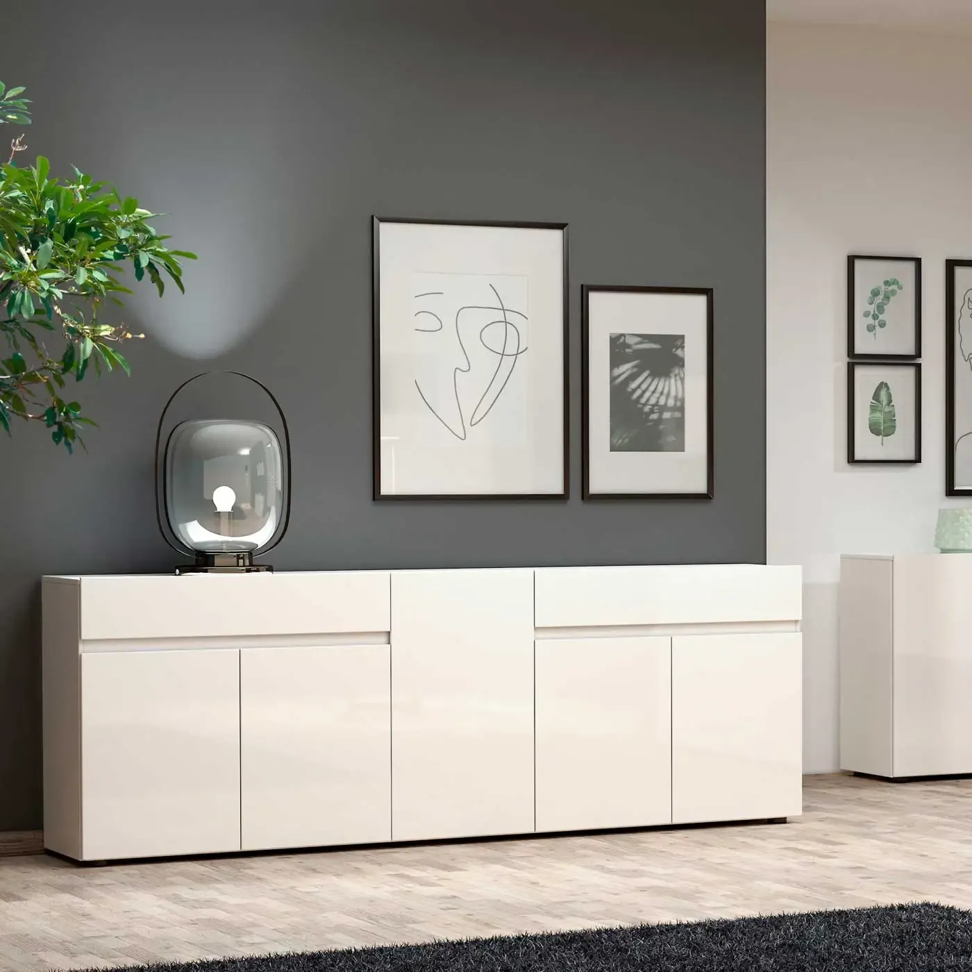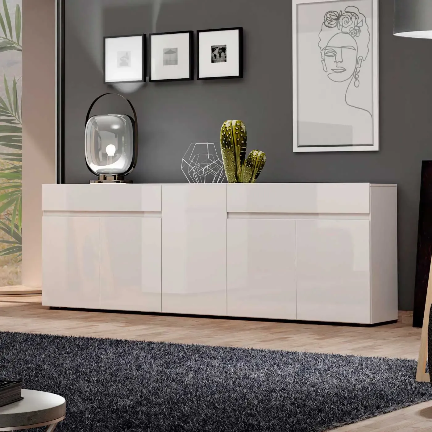 Madia moderna a 5 ante e 2 cassetti in finitura Bianca lucida, la credenza è dotata di 5 pratiche ante perfette per posizionare all'interno piatti, bicchieri, calici e da 2 cassetti dove potete mettere oggetti vari, posate, tovaglioli.