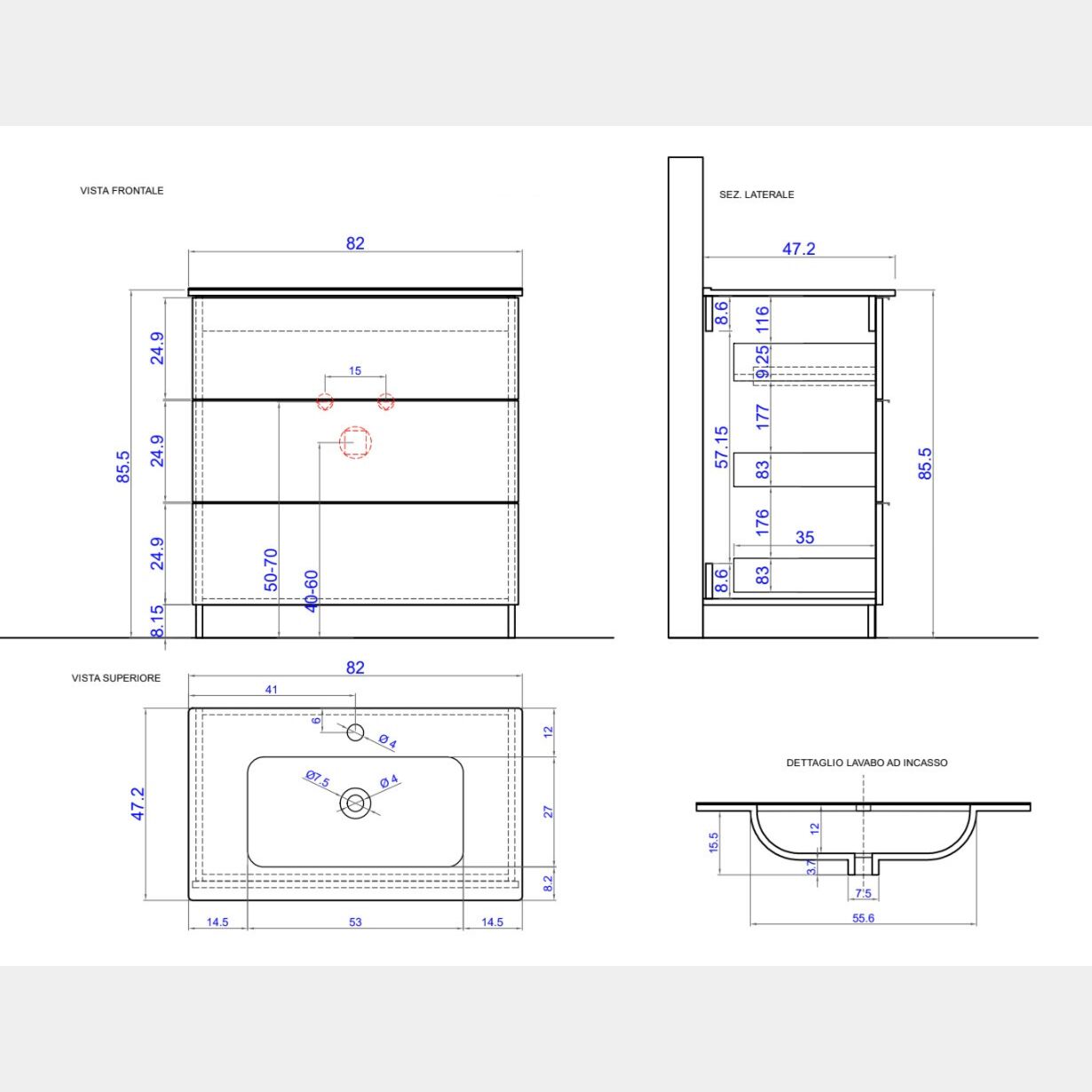 Il mobile da bagno salvaspazio larghezza 82 cm diventa un'ottima soluzione che arreda con stile l'ambiente, assicurando al contempo la massima funzionalità per chi lo utilizza. I tre ampi cassetti contengono e organizzano tutto ciò che può servire: asciugamani, prodotti per l'igiene, detersivi e cosmetici.